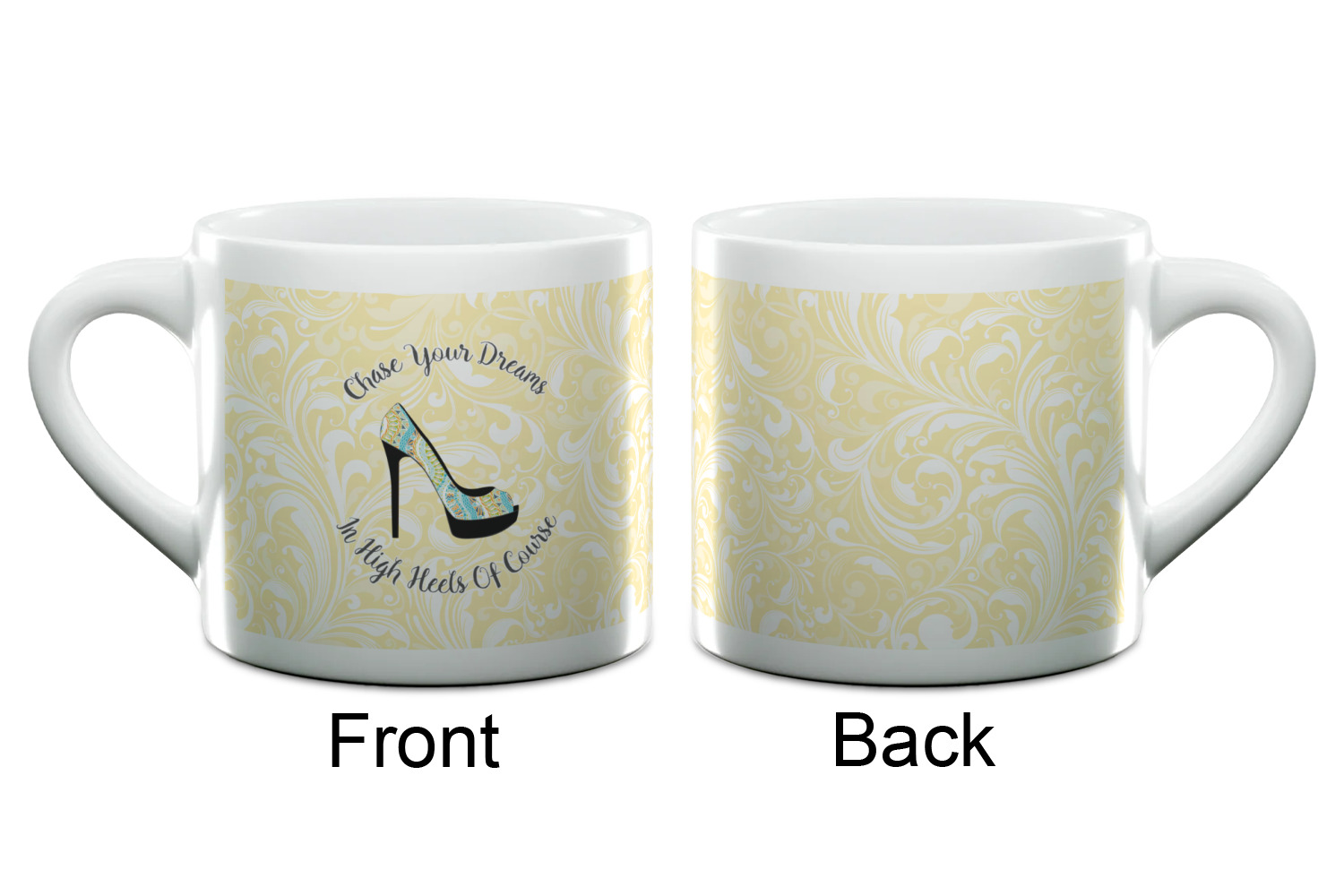 This High Heels Design with "Chase Your Dreams in High Heels Of Course" is simply beautiful. The design has a soft yellow leafy swirls background. The foreground is a beautiful stiletto high heel shoe filled with our abstract snakes pattern. We used our "graphic with arched text" style and have the words "Chase Your Dream" on top and "In High Heels of Course" on the bottom.