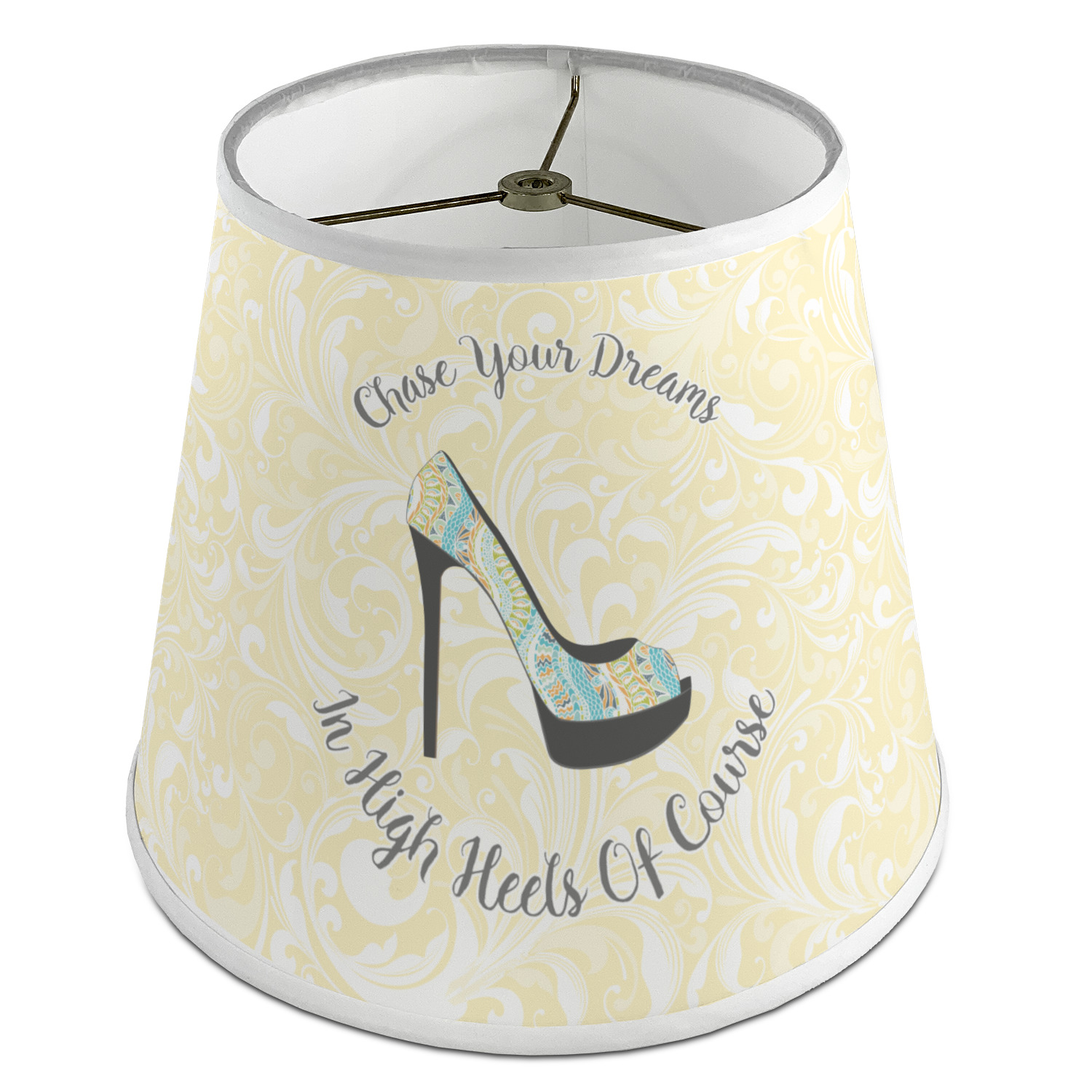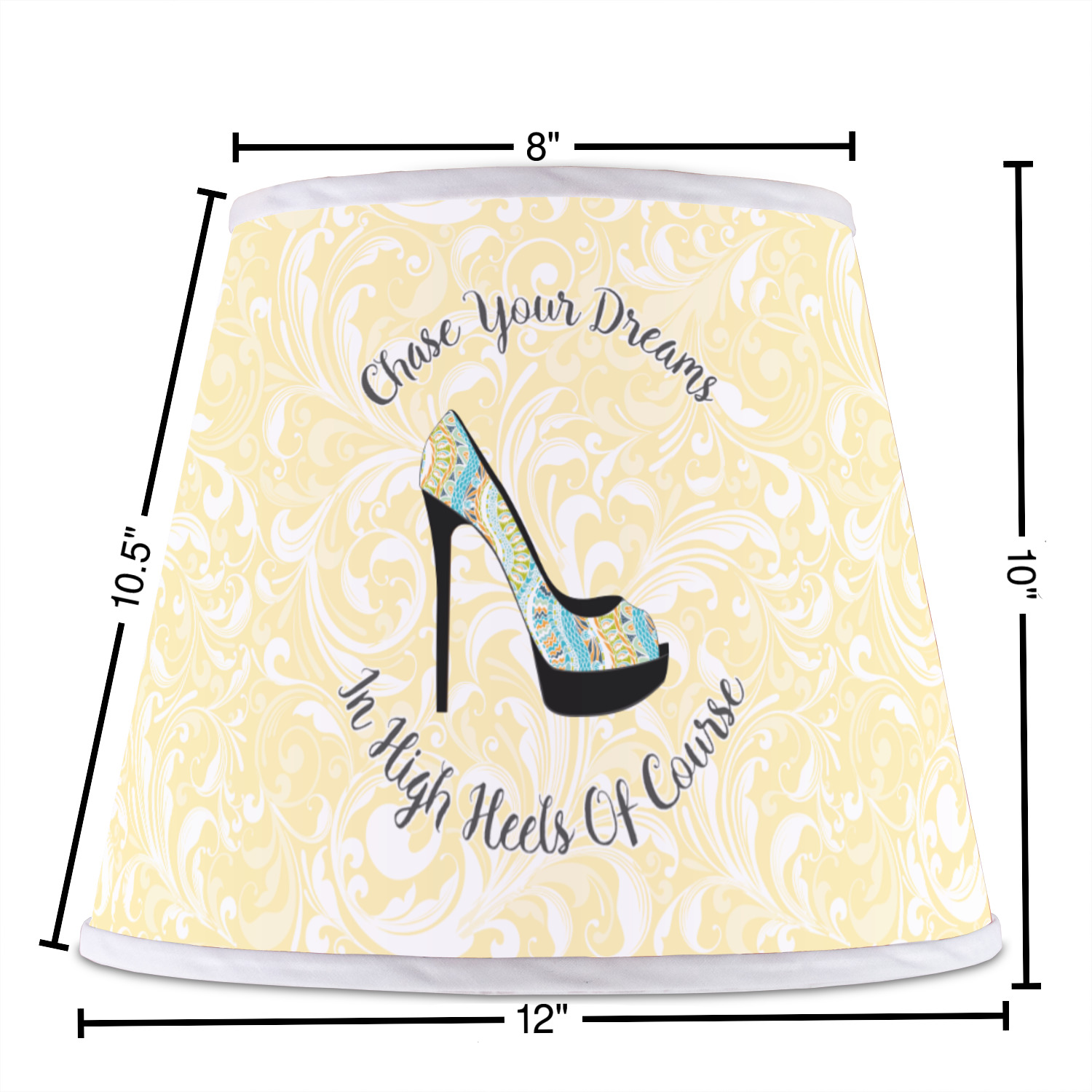 The base of this lampshade is 12 inches in diameter, and the top spans 8 inches in diameter. The total height of the lampshade is 10 inches. The angled nature of this custom lampshade concentrates the light, making it ideal for smaller spaces. This lampshade is made of matte, polyfilm, and displays your customization in its middle. The top and bottom of this colorful lamp shade are lined with a white fabric ribbon (which can be replaced with black inside the design studio) which frames your design and creates a sophisticated finish. As an UNO fitter lampshade, this unique lamp shade will fit a variety of bases.