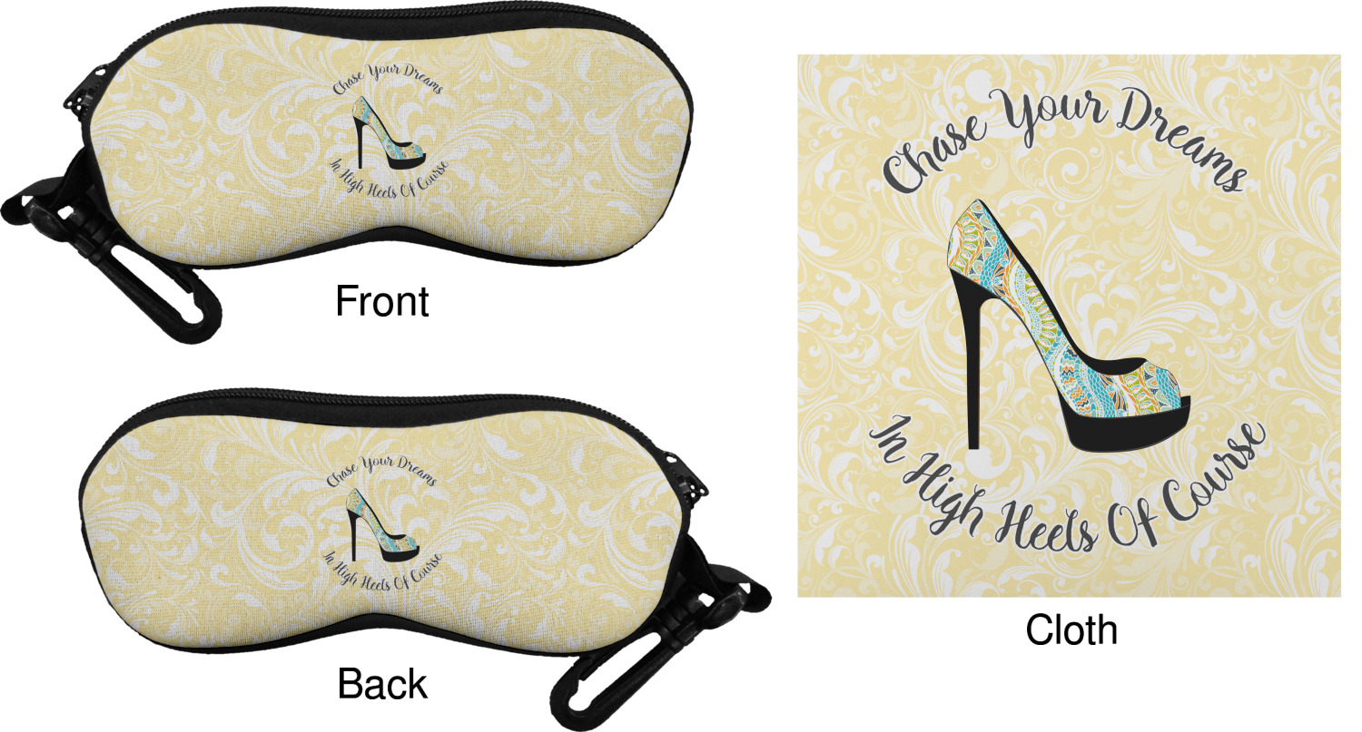 The cases have the design on both sides, a black zipper, and clips for hanging on a belt buckle or purse strap and also include matching lens cloths.