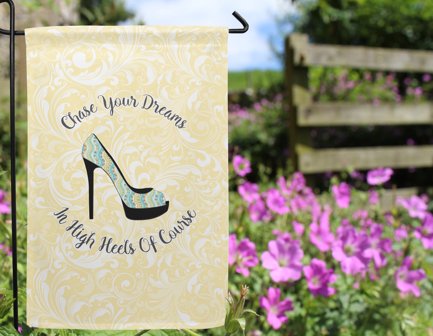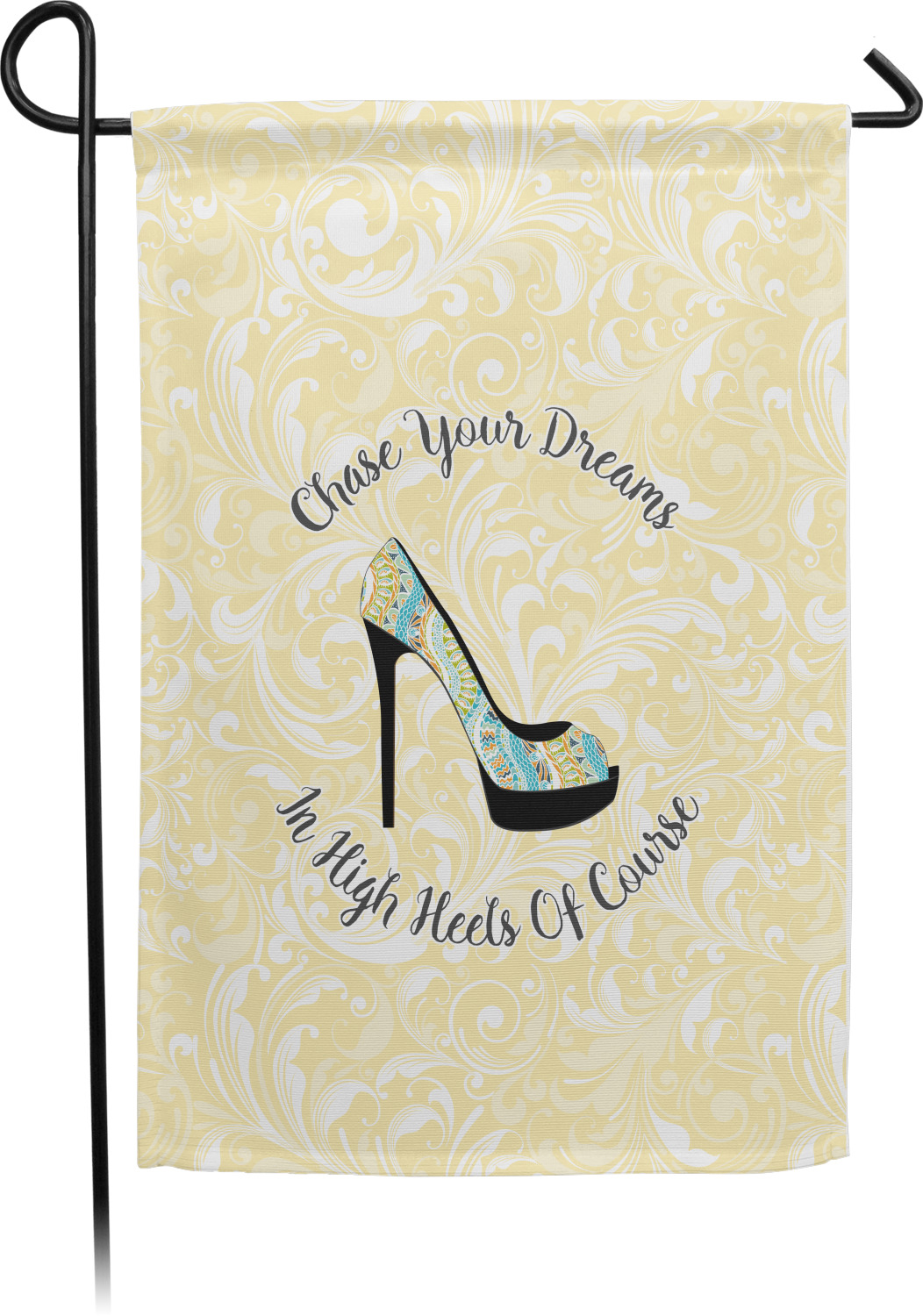 These custom garden flags are made of a durable, double-ply, polyester weave, allowing them to withstand the elements year round. The small flags measure at approximately 12 by 18 inches. The large flags measure out to 28 by 37 inches. You can order these decorative flags with your customization printed on the front only, or the front and back.
