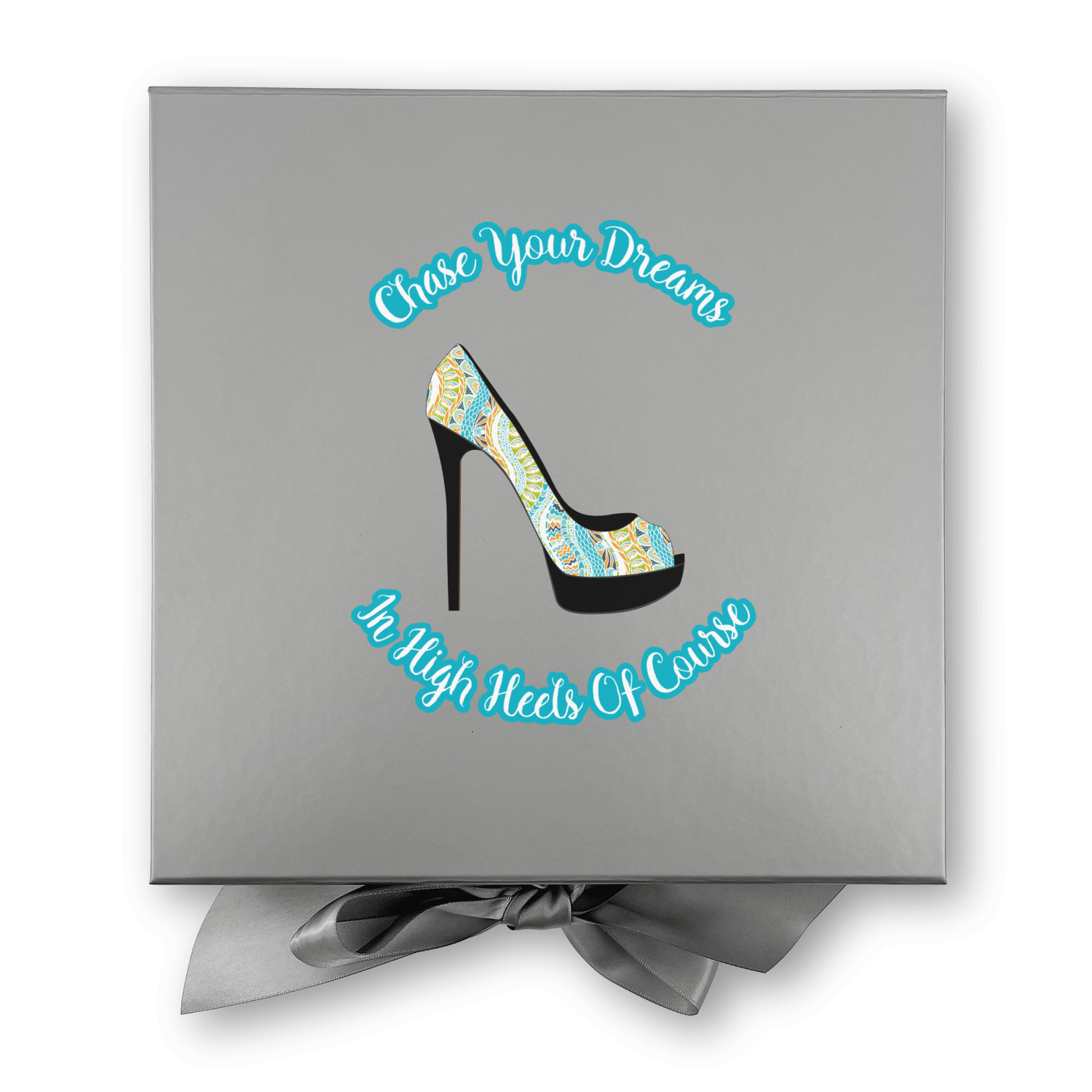 This High Heels Design with "Chase Your Dreams in High Heels Of Course" is simply beautiful. The design has a soft yellow leafy swirls background. The foreground is a beautiful stiletto high heel shoe filled with our abstract snakes pattern. We used our "graphic with arched text" style and have the words "Chase Your Dream" on top and "In High Heels of Course" on the bottom.