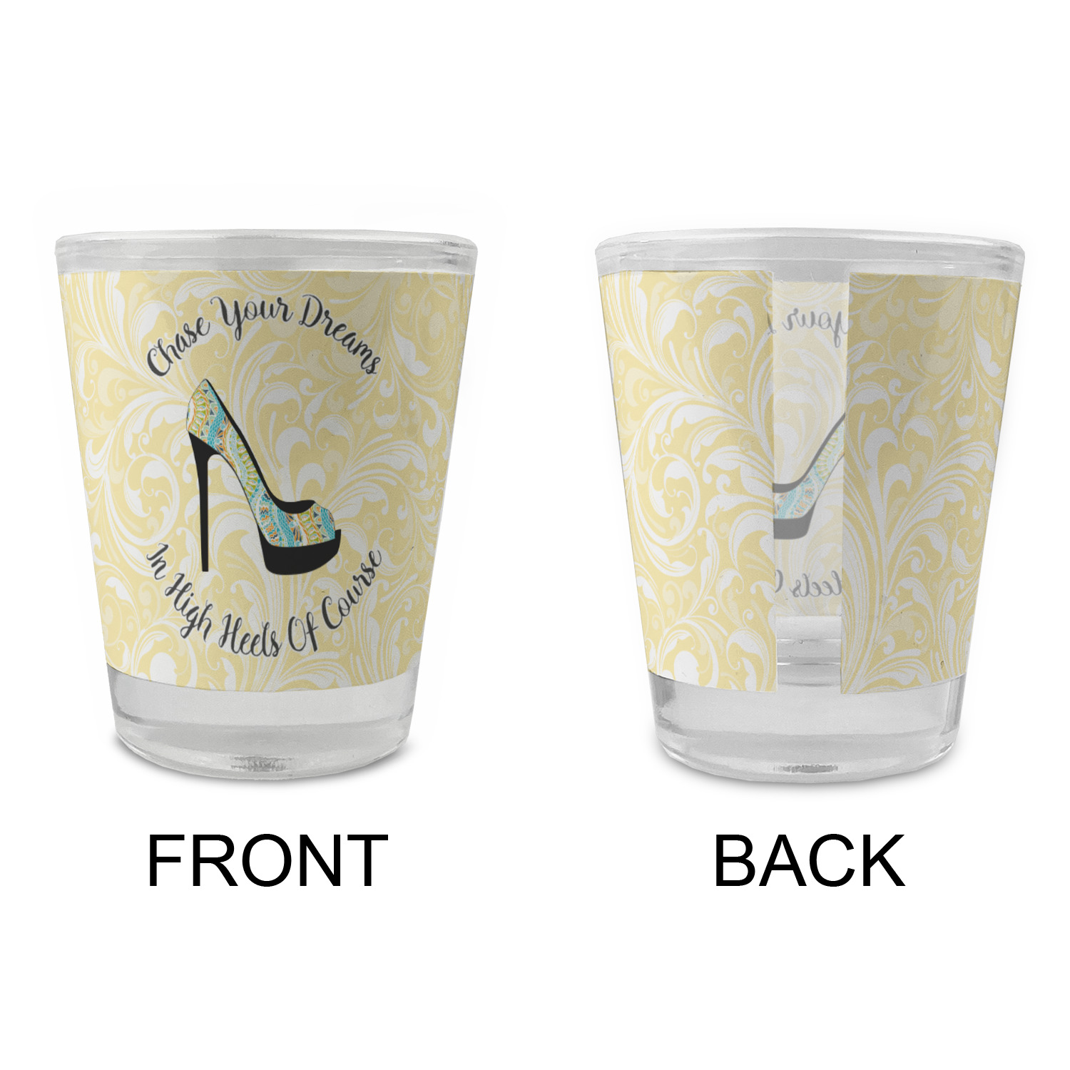 This High Heels Design with "Chase Your Dreams in High Heels Of Course" is simply beautiful. The design has a soft yellow leafy swirls background. The foreground is a beautiful stiletto high heel shoe filled with our abstract snakes pattern. We used our "graphic with arched text" style and have the words "Chase Your Dream" on top and "In High Heels of Course" on the bottom.