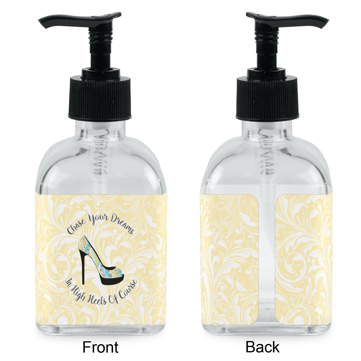 Crafted from a high-quality glass, these soap dispensers and lotion dispensers are durable and robust, while still looking elegant. They are sold with black pumps. Each soap dispenser pump measures at 6.5 by 2.25 inches. On these soap pumps, we display your customized design on a personalized vinyl adhesive on three sides. That way, you can judge how much liquid is in the bottles from the back.