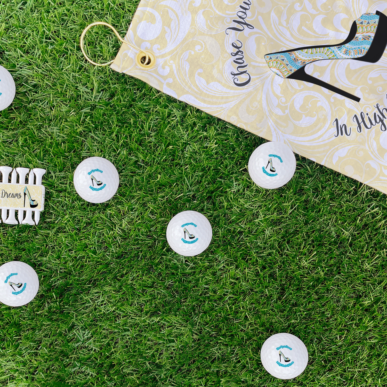 This High Heels Design with "Chase Your Dreams in High Heels Of Course" is simply beautiful. The design has a soft yellow leafy swirls background. The foreground is a beautiful stiletto high heel shoe filled with our abstract snakes pattern. We used our "graphic with arched text" style and have the words "Chase Your Dream" on top and "In High Heels of Course" on the bottom.