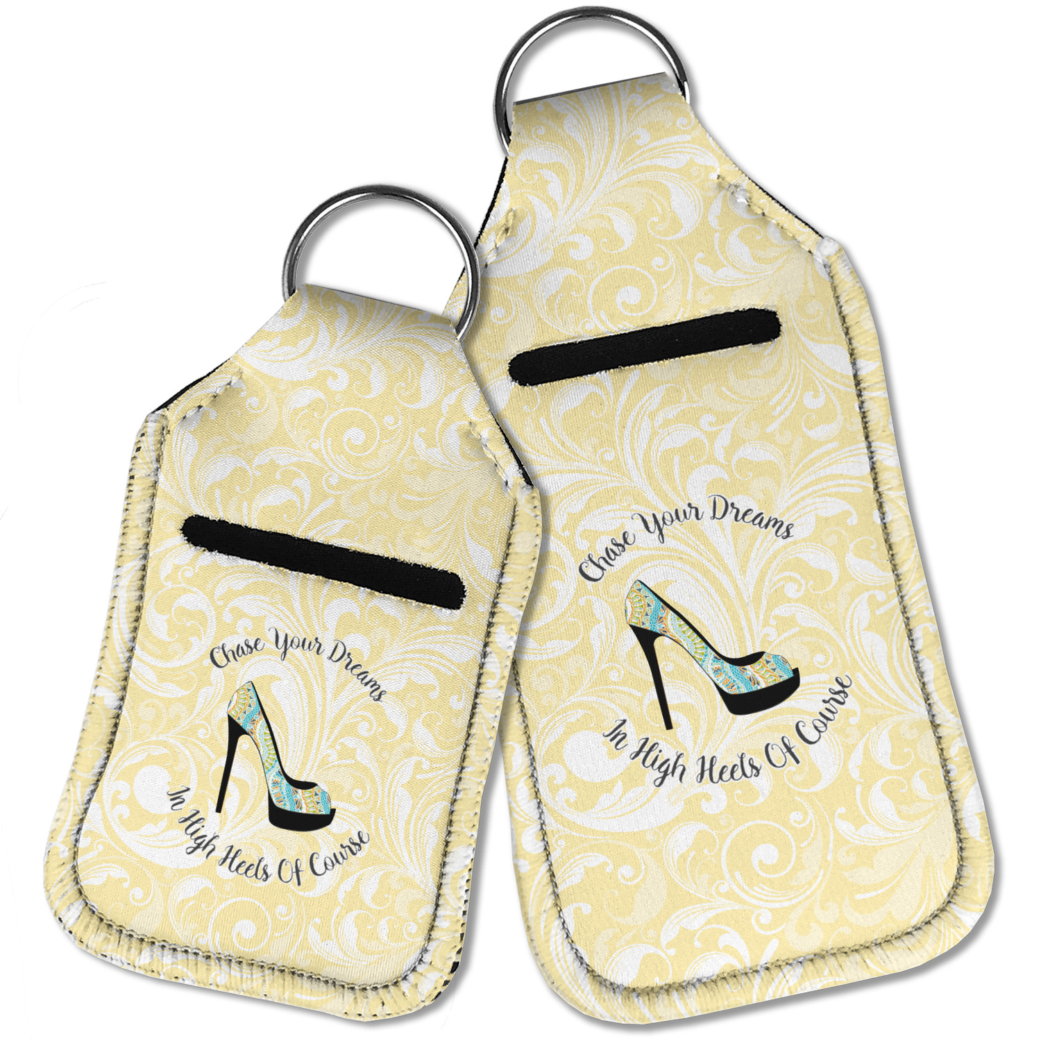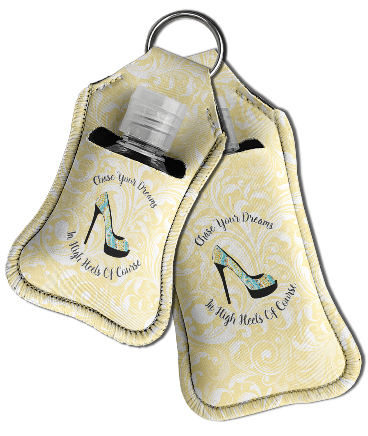 Each hand sanitizer holder comes with its own empty travel-sized, refillable hand sanitizer sure to fit snug in your customized sanitizer case! Our hand sanitizer cases are a durable, yet soft neoprene material sure to last any daily activities or travel agenda. Customize and personalize a hand sanitizer bottle holder with one of our two sizes - small (4.25" x 2.25") or large (5.5" x 2.5"). Each travel sanitizer holder comes with a keyring for attachment on bags, keys, or more!