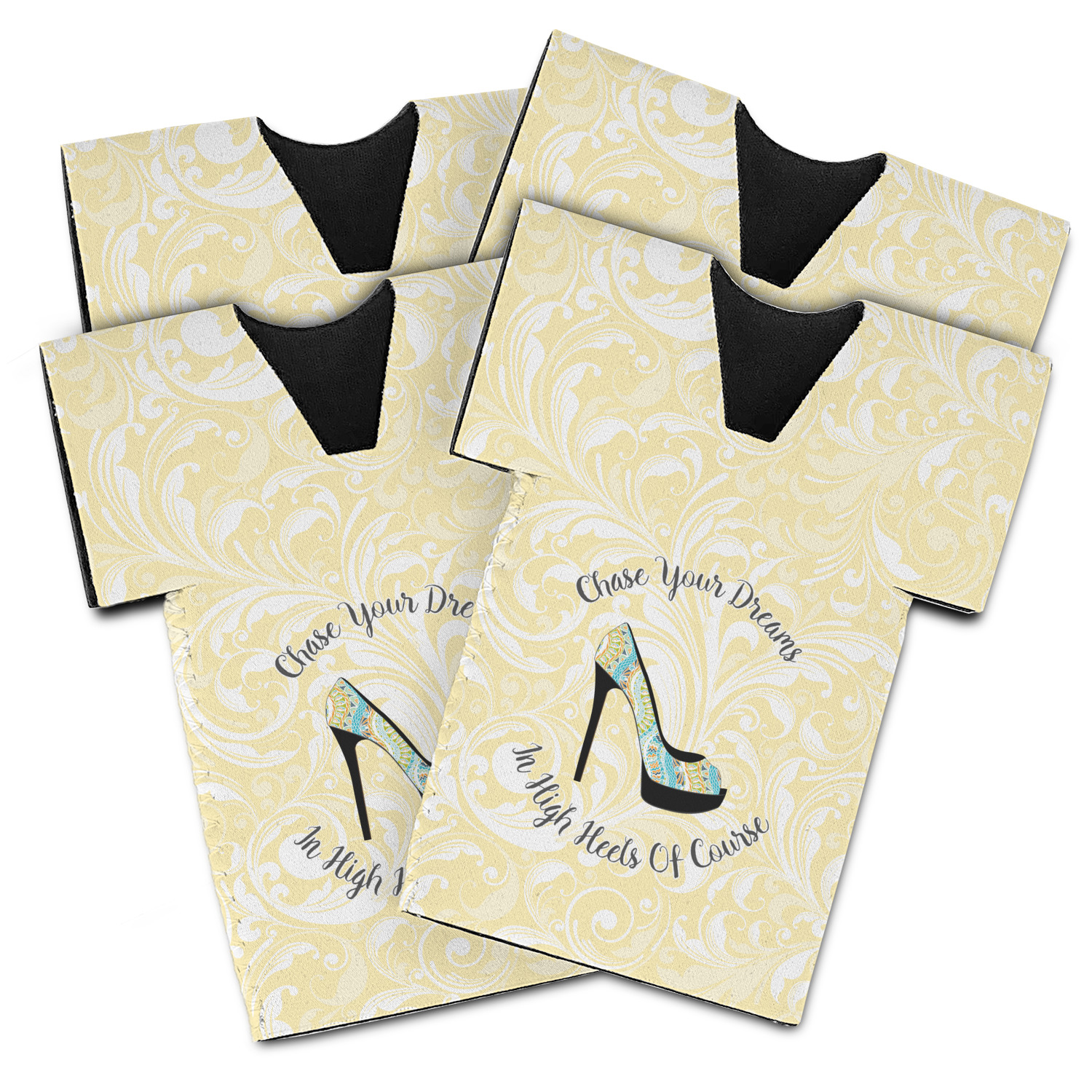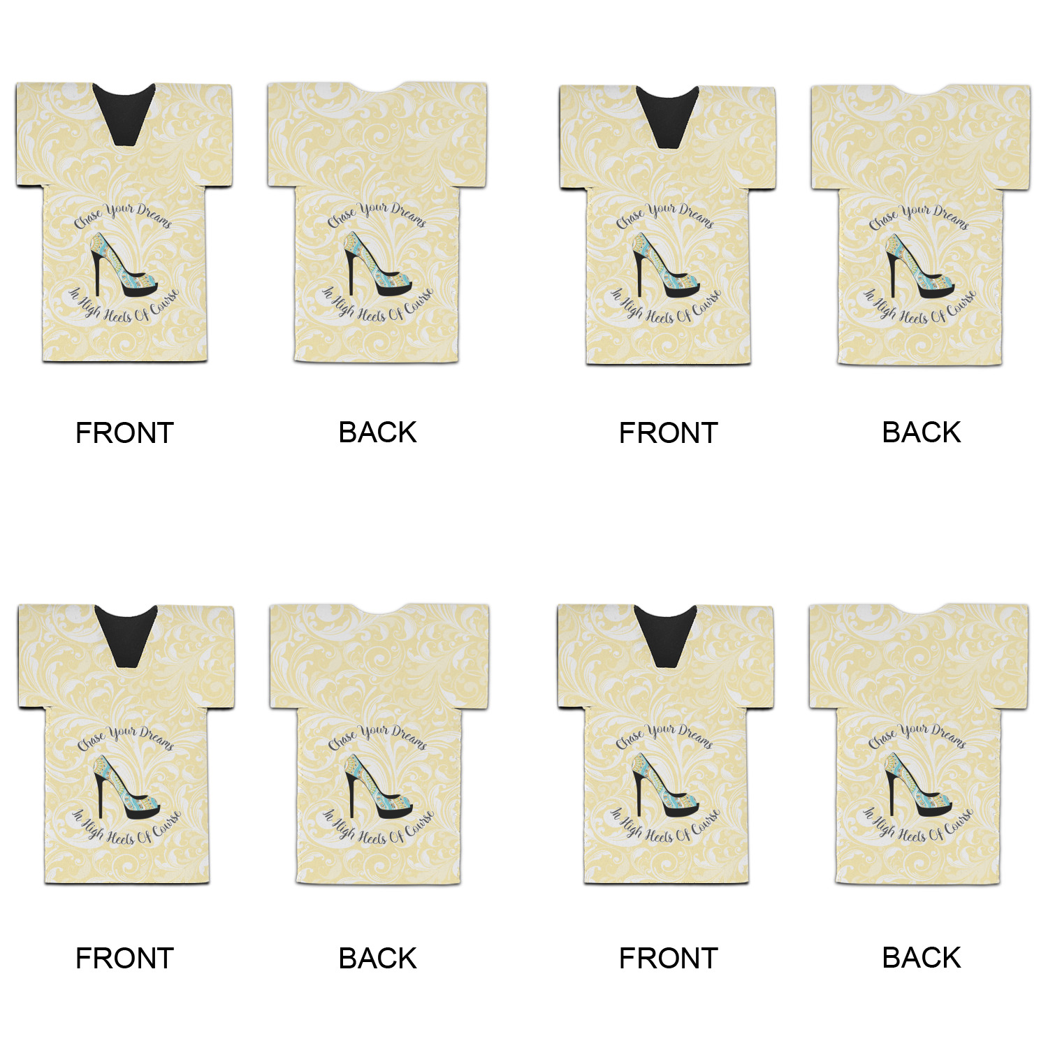 This High Heels Design with "Chase Your Dreams in High Heels Of Course" is simply beautiful. The design has a soft yellow leafy swirls background. The foreground is a beautiful stiletto high heel shoe filled with our abstract snakes pattern. We used our "graphic with arched text" style and have the words "Chase Your Dream" on top and "In High Heels of Course" on the bottom.