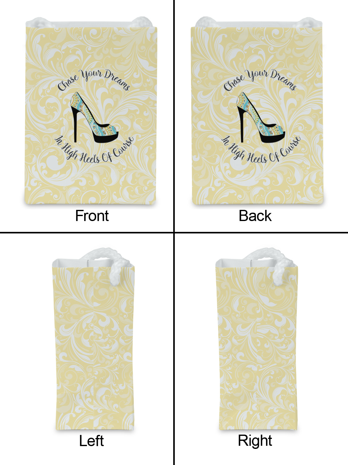 These jewelry gift bags are available in two finishes - matte or gloss. The are digitally printed in full color, then cut down to size, scored & folded. A single handle is attached.