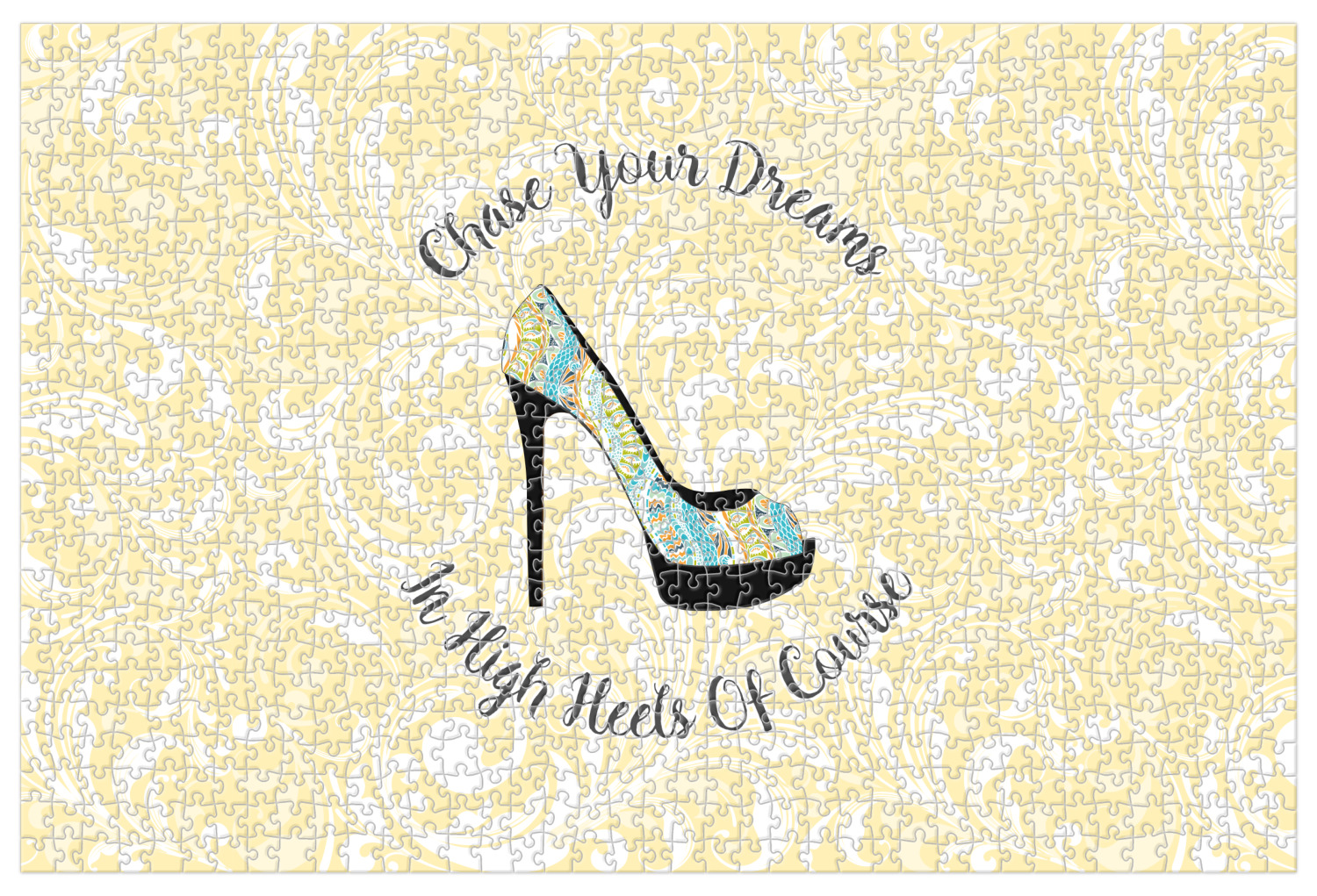 This High Heels Design with "Chase Your Dreams in High Heels Of Course" is simply beautiful. The design has a soft yellow leafy swirls background. The foreground is a beautiful stiletto high heel shoe filled with our abstract snakes pattern. We used our "graphic with arched text" style and have the words "Chase Your Dream" on top and "In High Heels of Course" on the bottom.