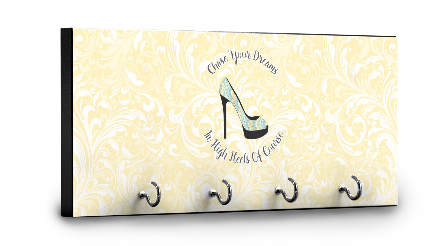 This 11" x 5" key hanger is made of sturdy wood and has four metal hooks lining the bottom. This is the perfect size for a family with several drivers. Not only can you hang keys on it though, but pet leashes and other small items. The board is black on the sides and back and is printed with the design of your choice on the front.
