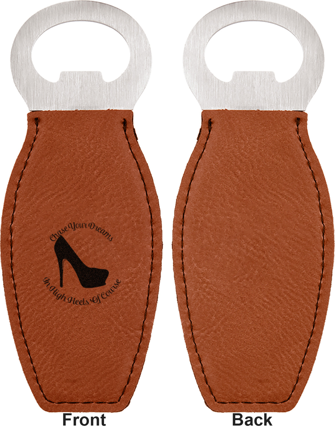 Built from stainless steel, these custom bottle openers are wrapped in a cognac-colored leatherette. Sharp, black stitching lines the edges for extra durability and a finished touch. Your personalization is laser-engraved onto the surface of this leatherette, leaving behind a crisp, black coloration. At 4.6 by 1.8 inches, this beer bottle opener gives you much of leverage when trying to open a stubborn bottle. On the opposite end of the opener, you'll find a magnet that you can use to display your new, unique bottle opener!