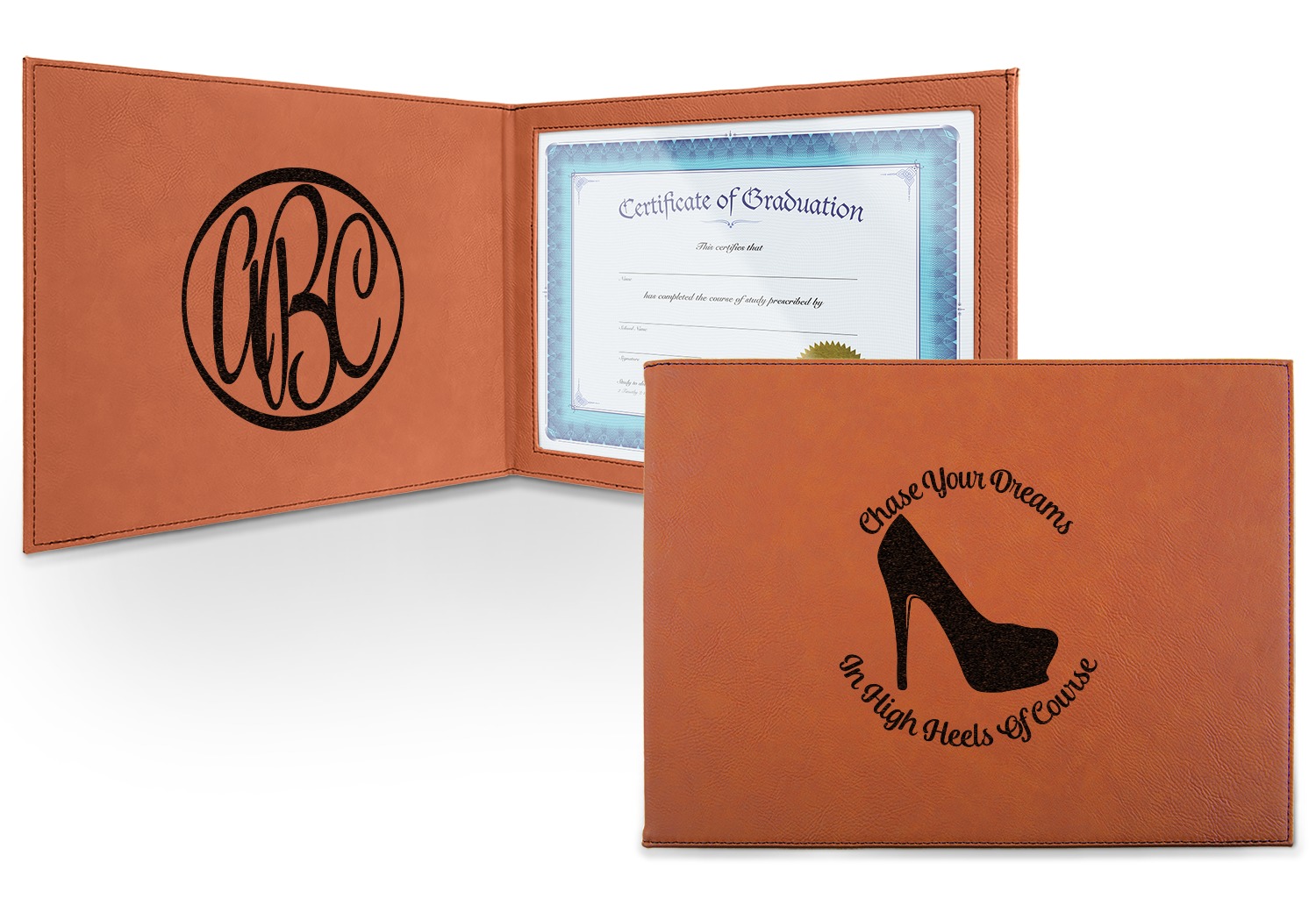 This cognac-colored, leatherette certificate jacket is the ideal way to display or store your hard-earned certificate. When closed, the custom certificate holder measures at 12 by 9 inches. The interior of the certificate cover includes a clear, vinyl window to encase your diploma. The window measures at around 10.5 by 7.5 inches and can accommodate a diploma that measures at up to 8.5 by 11 inches. You can either choose to have your customization laser engraved on the front and interior, or solely the front.