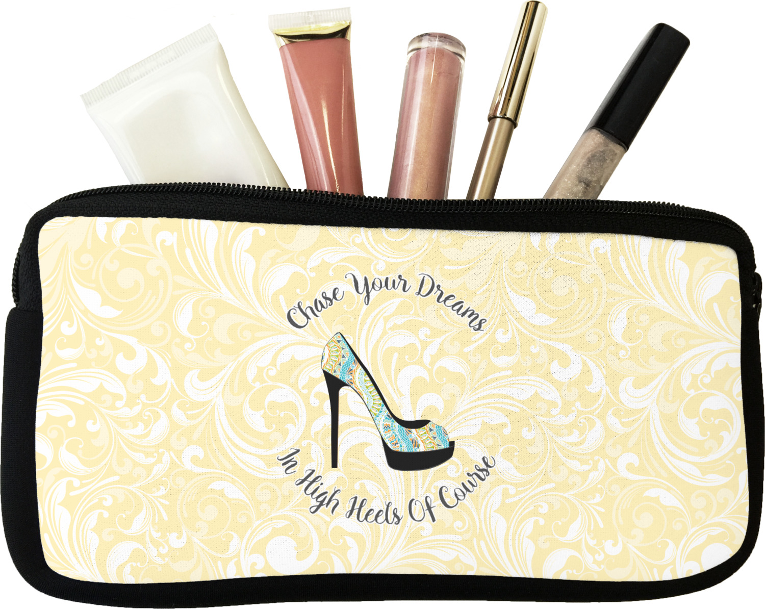 Our personalized makeup bags are available in many different designs, patterns and colors - so you are sure to find one that will love. They are made of neoprene (same material as wet-suits) and thus are water resistant, so spillages in your makeup bag will not end up all over you purse. They are customized on one side and are black on the other side and the zipper is black as well.