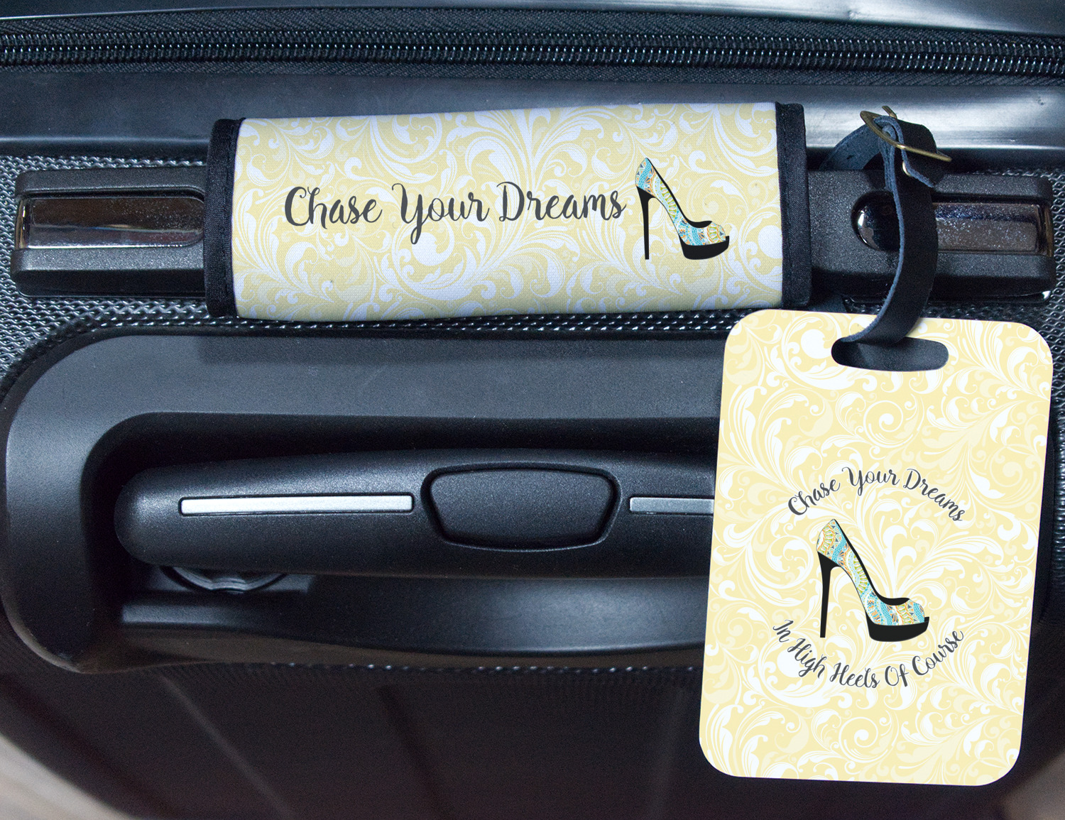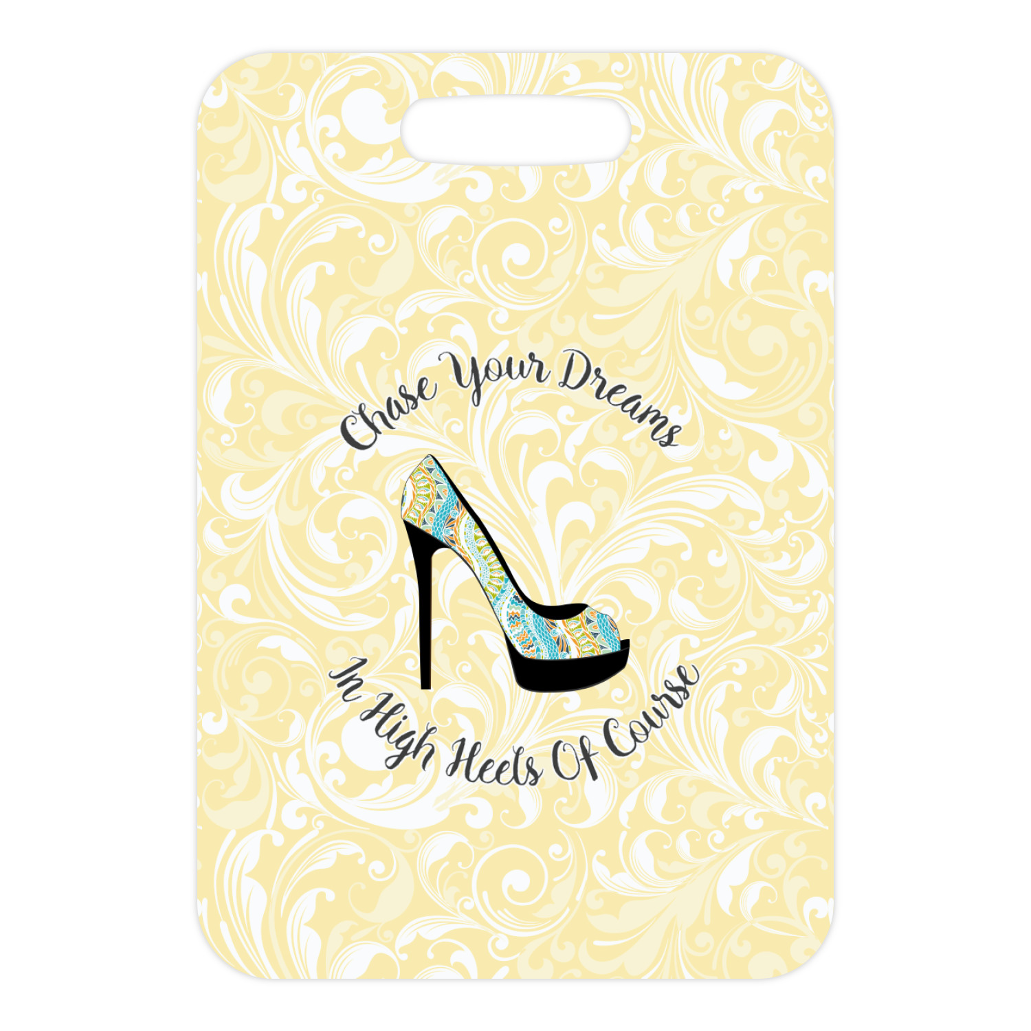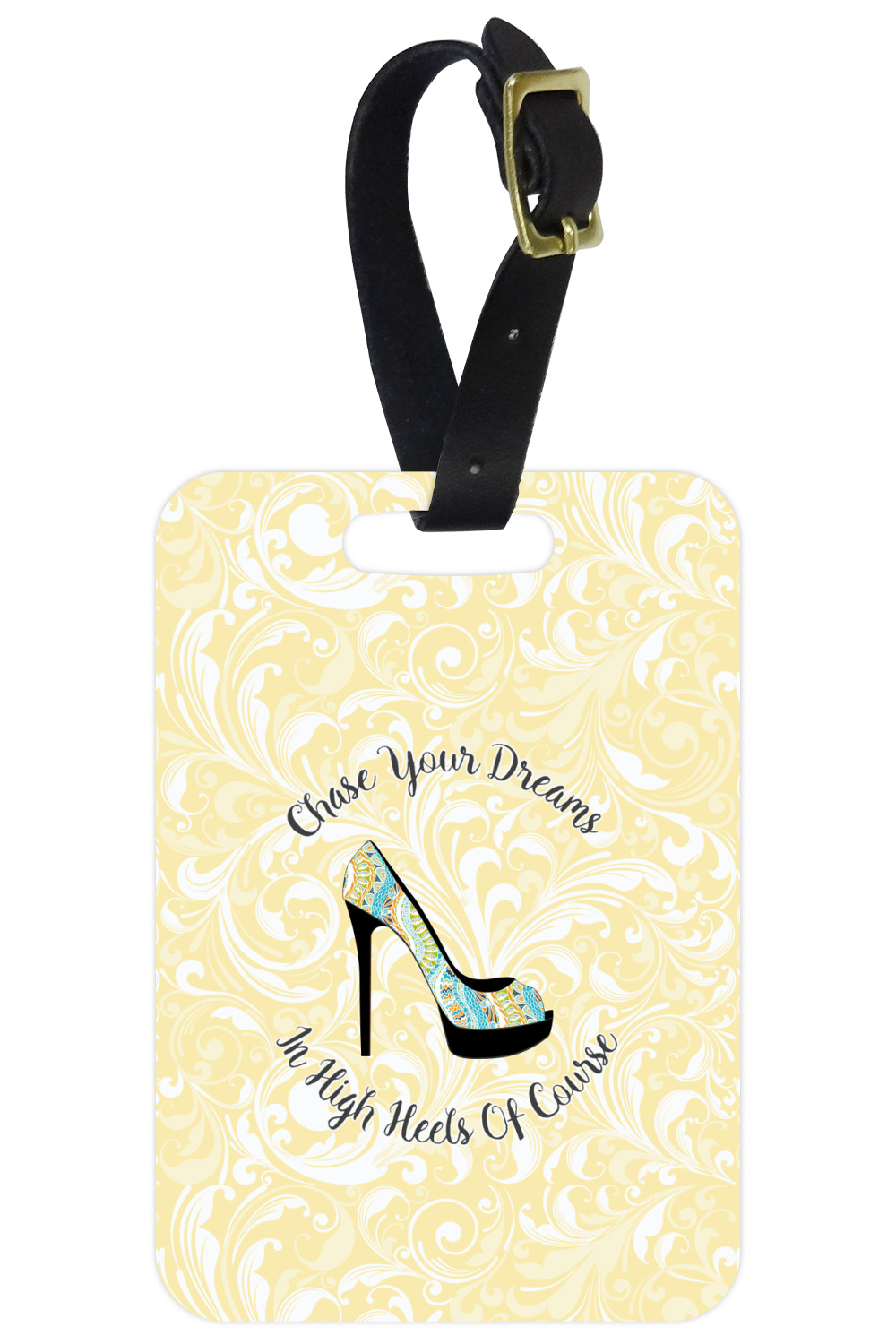 This High Heels Design with "Chase Your Dreams in High Heels Of Course" is simply beautiful. The design has a soft yellow leafy swirls background. The foreground is a beautiful stiletto high heel shoe filled with our abstract snakes pattern. We used our "graphic with arched text" style and have the words "Chase Your Dream" on top and "In High Heels of Course" on the bottom.