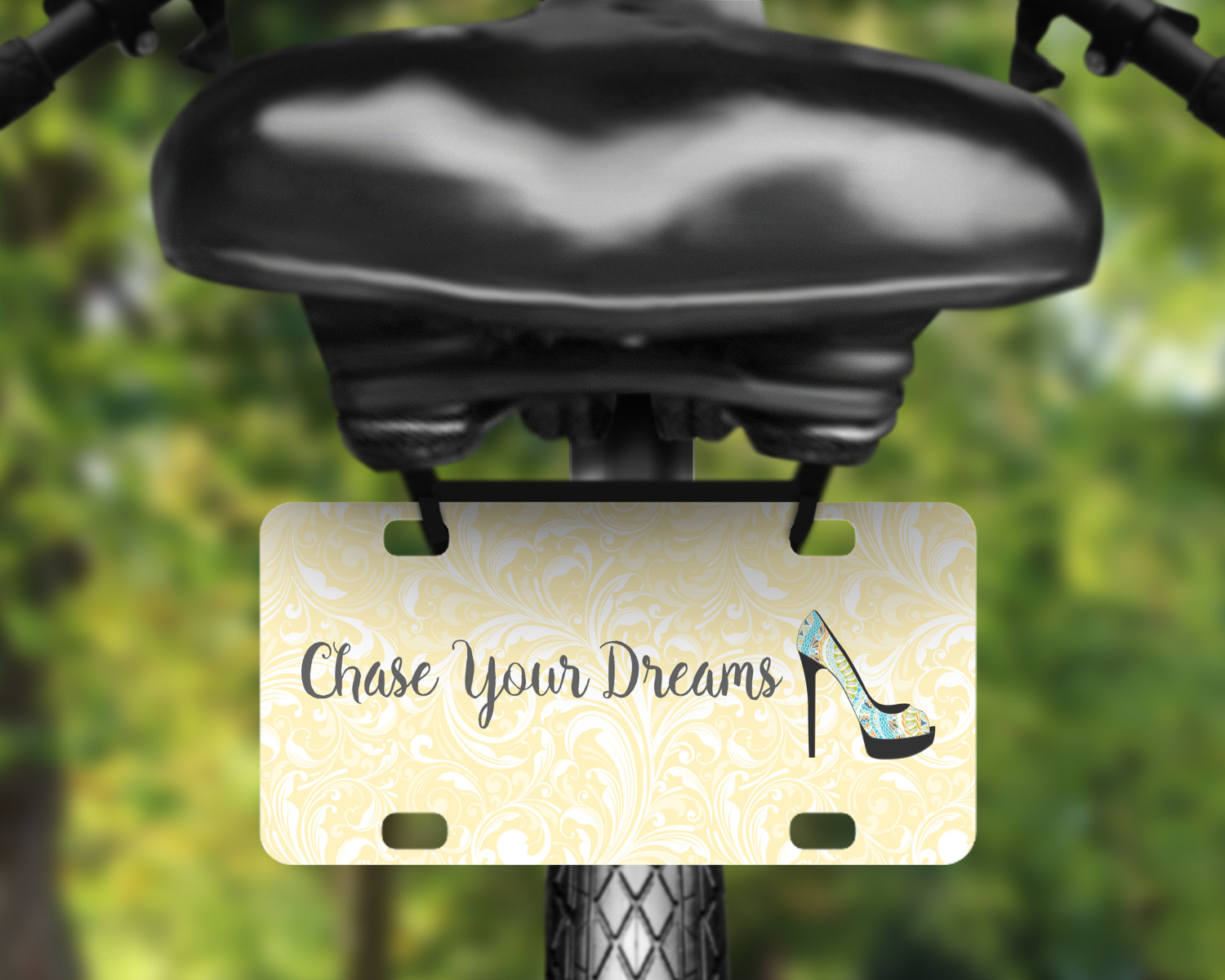 This High Heels Design with "Chase Your Dreams in High Heels Of Course" is simply beautiful. The design has a soft yellow leafy swirls background. The foreground is a beautiful stiletto high heel shoe filled with our abstract snakes pattern. We used our "graphic with arched text" style and have the words "Chase Your Dream" on top and "In High Heels of Course" on the bottom.