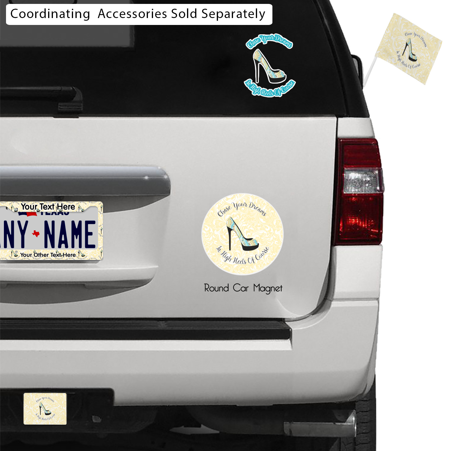 This High Heels Design with "Chase Your Dreams in High Heels Of Course" is simply beautiful. The design has a soft yellow leafy swirls background. The foreground is a beautiful stiletto high heel shoe filled with our abstract snakes pattern. We used our "graphic with arched text" style and have the words "Chase Your Dream" on top and "In High Heels of Course" on the bottom.