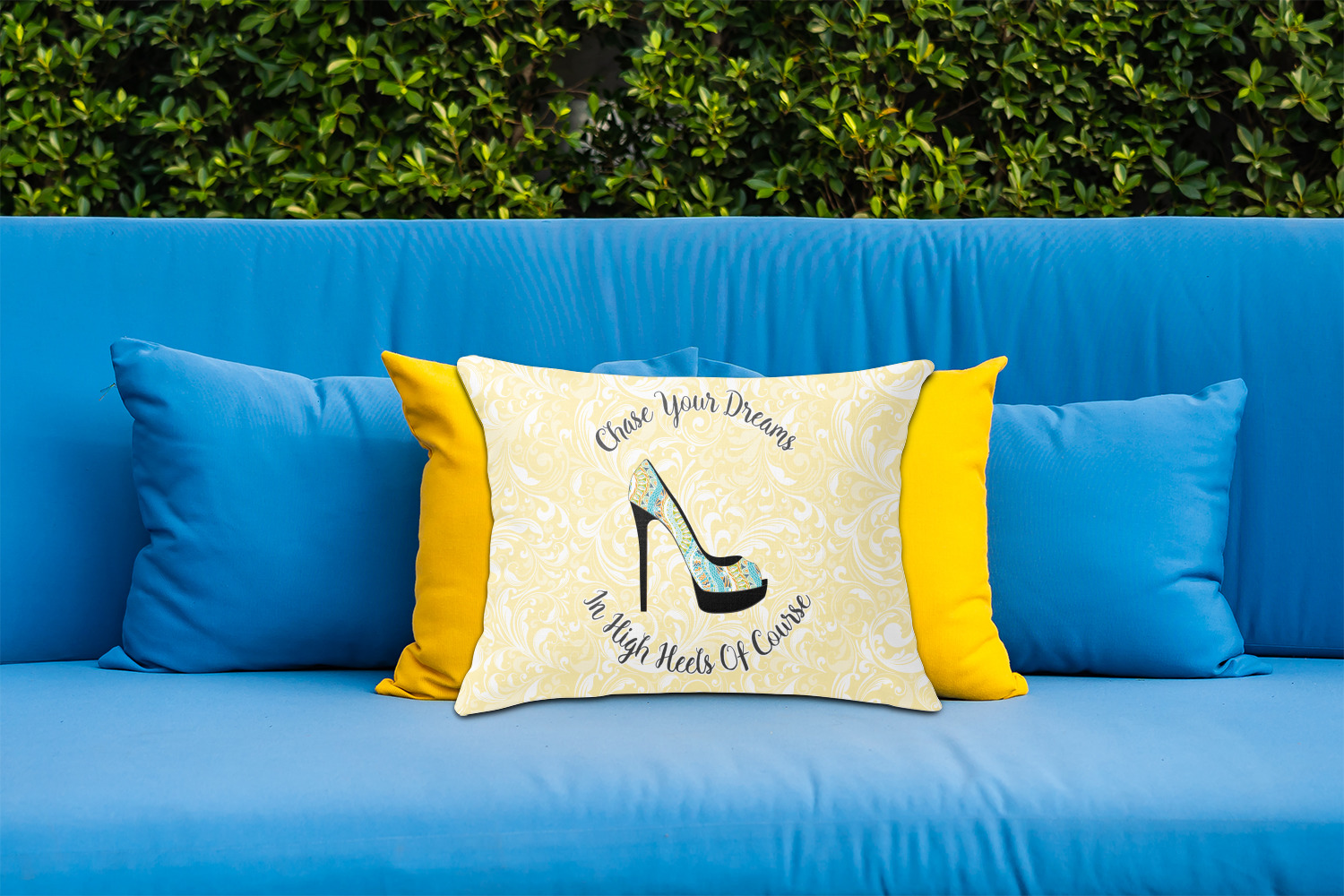 This High Heels Design with "Chase Your Dreams in High Heels Of Course" is simply beautiful. The design has a soft yellow leafy swirls background. The foreground is a beautiful stiletto high heel shoe filled with our abstract snakes pattern. We used our "graphic with arched text" style and have the words "Chase Your Dream" on top and "In High Heels of Course" on the bottom.