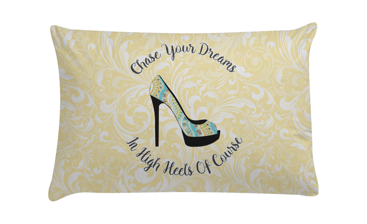 This High Heels Design with "Chase Your Dreams in High Heels Of Course" is simply beautiful. The design has a soft yellow leafy swirls background. The foreground is a beautiful stiletto high heel shoe filled with our abstract snakes pattern. We used our "graphic with arched text" style and have the words "Chase Your Dream" on top and "In High Heels of Course" on the bottom.