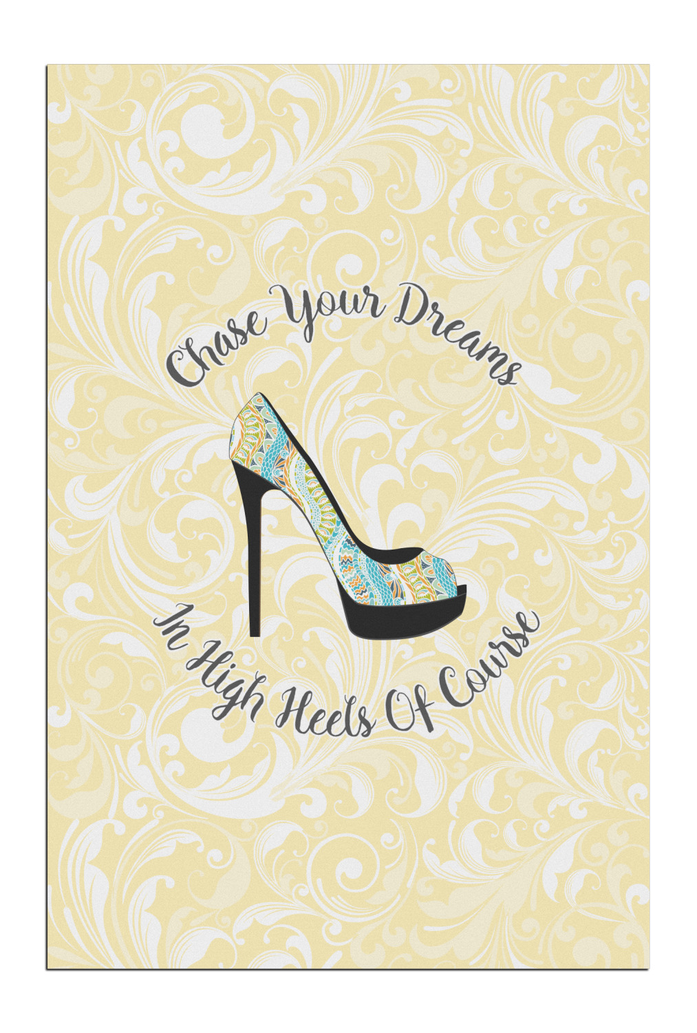 This High Heels Design with "Chase Your Dreams in High Heels Of Course" is simply beautiful. The design has a soft yellow leafy swirls background. The foreground is a beautiful stiletto high heel shoe filled with our abstract snakes pattern. We used our "graphic with arched text" style and have the words "Chase Your Dream" on top and "In High Heels of Course" on the bottom.