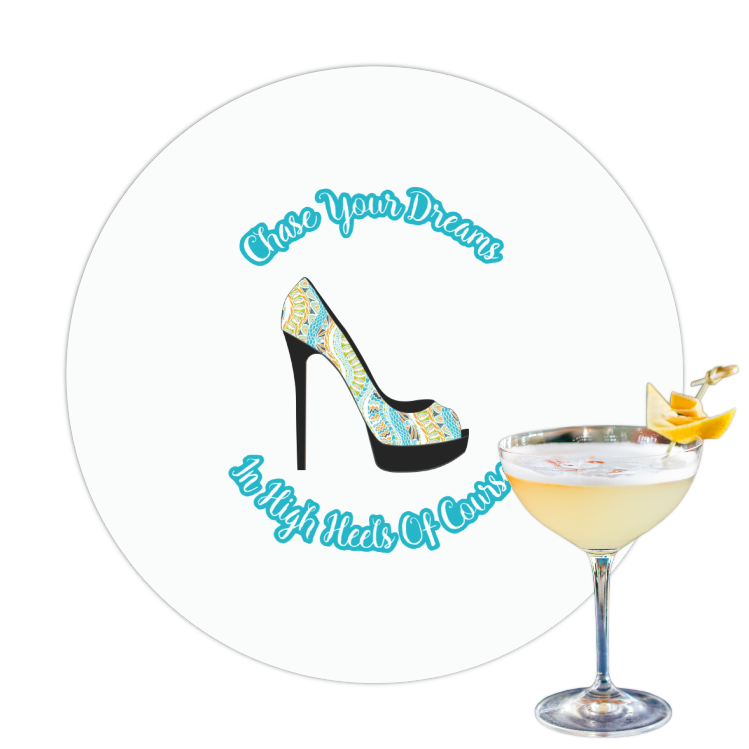 This High Heels Design with "Chase Your Dreams in High Heels Of Course" is simply beautiful. The design has a soft yellow leafy swirls background. The foreground is a beautiful stiletto high heel shoe filled with our abstract snakes pattern. We used our "graphic with arched text" style and have the words "Chase Your Dream" on top and "In High Heels of Course" on the bottom.