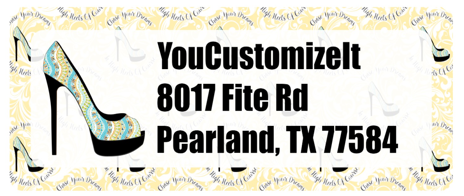 This High Heels Design with "Chase Your Dreams in High Heels Of Course" is simply beautiful. The design has a soft yellow leafy swirls background. The foreground is a beautiful stiletto high heel shoe filled with our abstract snakes pattern. We used our "graphic with arched text" style and have the words "Chase Your Dream" on top and "In High Heels of Course" on the bottom.