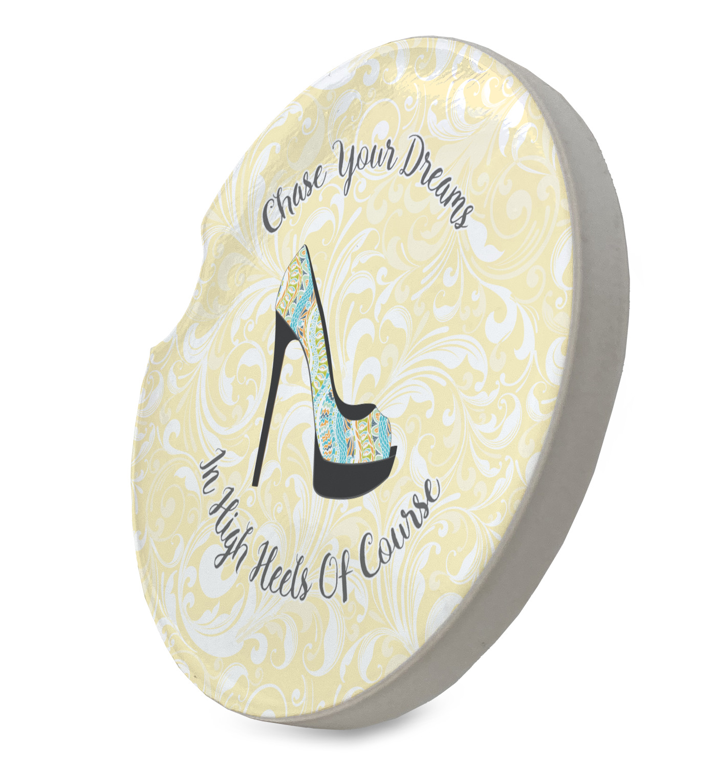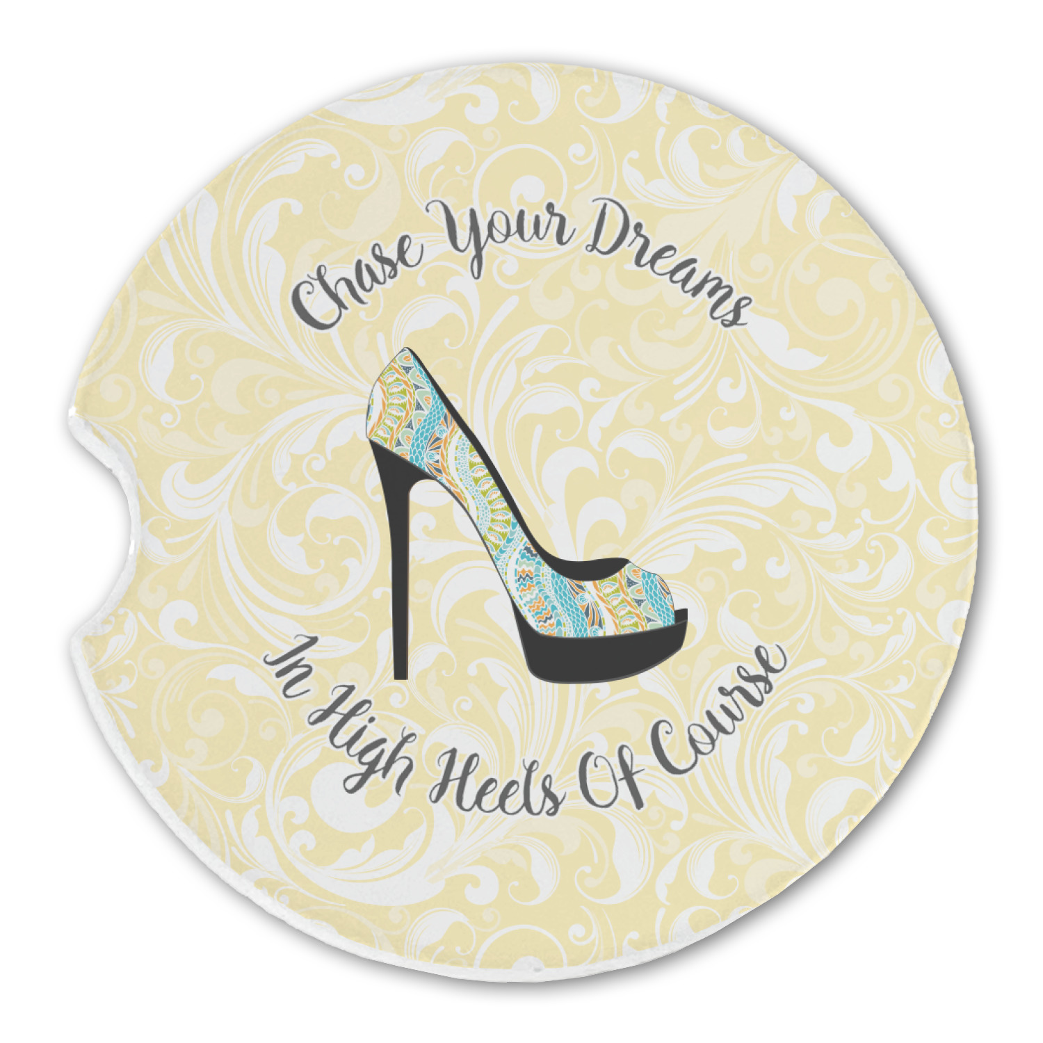 This High Heels Design with "Chase Your Dreams in High Heels Of Course" is simply beautiful. The design has a soft yellow leafy swirls background. The foreground is a beautiful stiletto high heel shoe filled with our abstract snakes pattern. We used our "graphic with arched text" style and have the words "Chase Your Dream" on top and "In High Heels of Course" on the bottom.