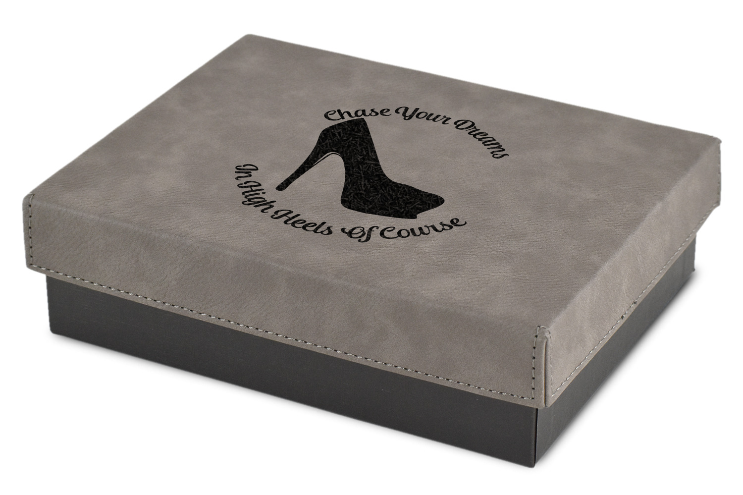 These gift boxes are available in 3 different sizes to accommodate various sized gifts. Available in gray as a neutral color for any occasion as well as to showcase your design boldly. Engraved with a laser this high quality paper board and faux leather gift box is unique and makes any gift stand out.