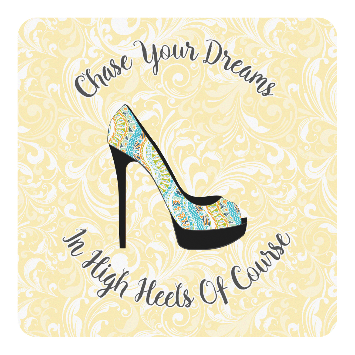 This High Heels Design with "Chase Your Dreams in High Heels Of Course" is simply beautiful. The design has a soft yellow leafy swirls background. The foreground is a beautiful stiletto high heel shoe filled with our abstract snakes pattern. We used our "graphic with arched text" style and have the words "Chase Your Dream" on top and "In High Heels of Course" on the bottom.