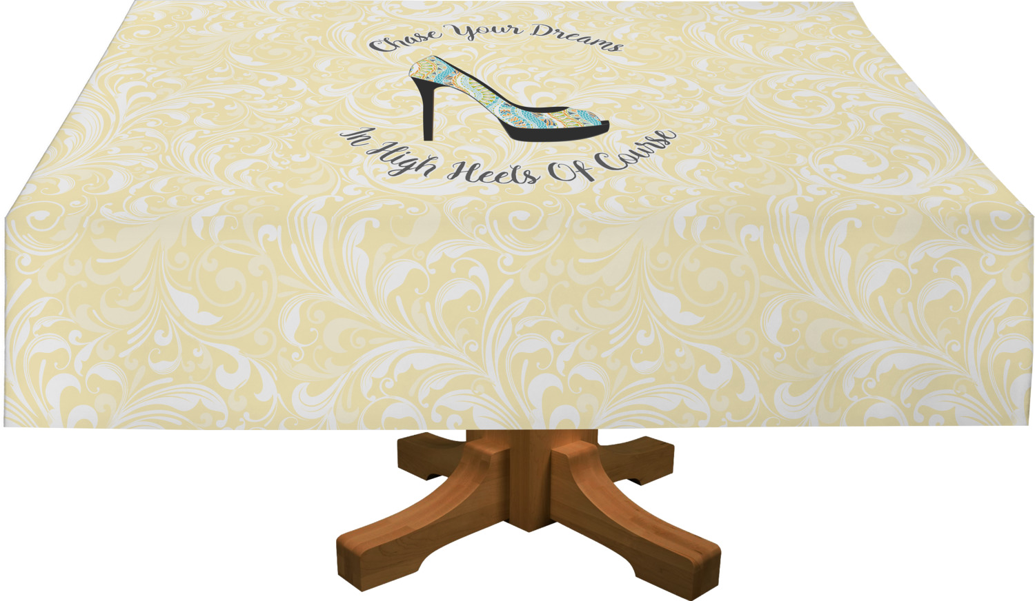 This High Heels Design with "Chase Your Dreams in High Heels Of Course" is simply beautiful. The design has a soft yellow leafy swirls background. The foreground is a beautiful stiletto high heel shoe filled with our abstract snakes pattern. We used our "graphic with arched text" style and have the words "Chase Your Dream" on top and "In High Heels of Course" on the bottom.