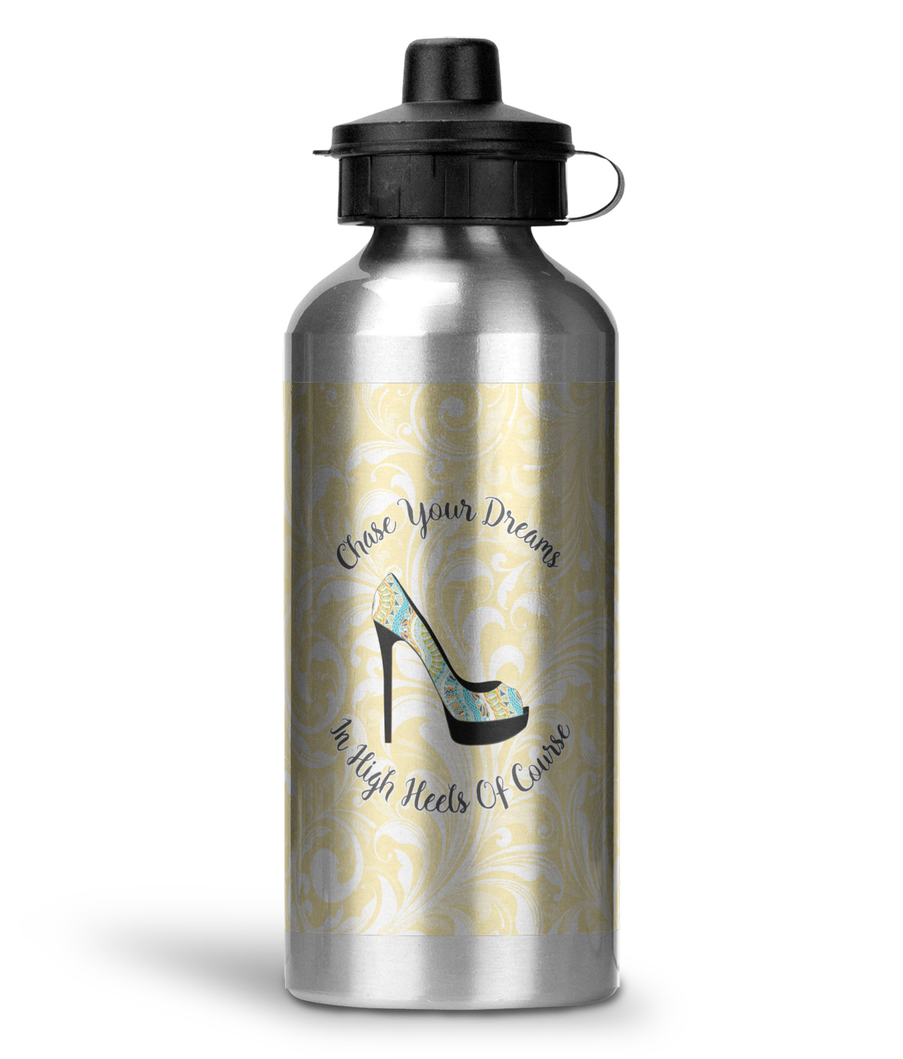 This High Heels Design with "Chase Your Dreams in High Heels Of Course" is simply beautiful. The design has a soft yellow leafy swirls background. The foreground is a beautiful stiletto high heel shoe filled with our abstract snakes pattern. We used our "graphic with arched text" style and have the words "Chase Your Dream" on top and "In High Heels of Course" on the bottom.