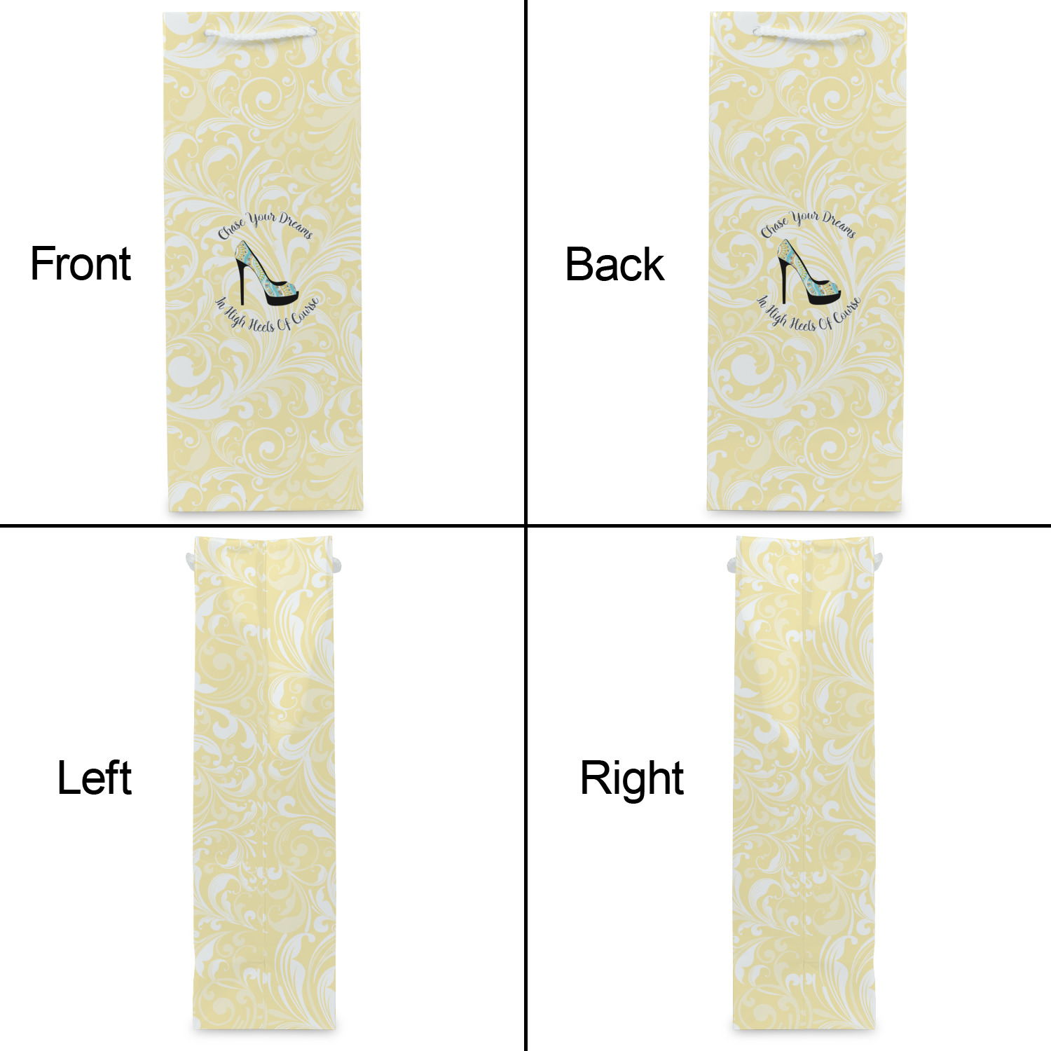 This High Heels Design with "Chase Your Dreams in High Heels Of Course" is simply beautiful. The design has a soft yellow leafy swirls background. The foreground is a beautiful stiletto high heel shoe filled with our abstract snakes pattern. We used our "graphic with arched text" style and have the words "Chase Your Dream" on top and "In High Heels of Course" on the bottom.