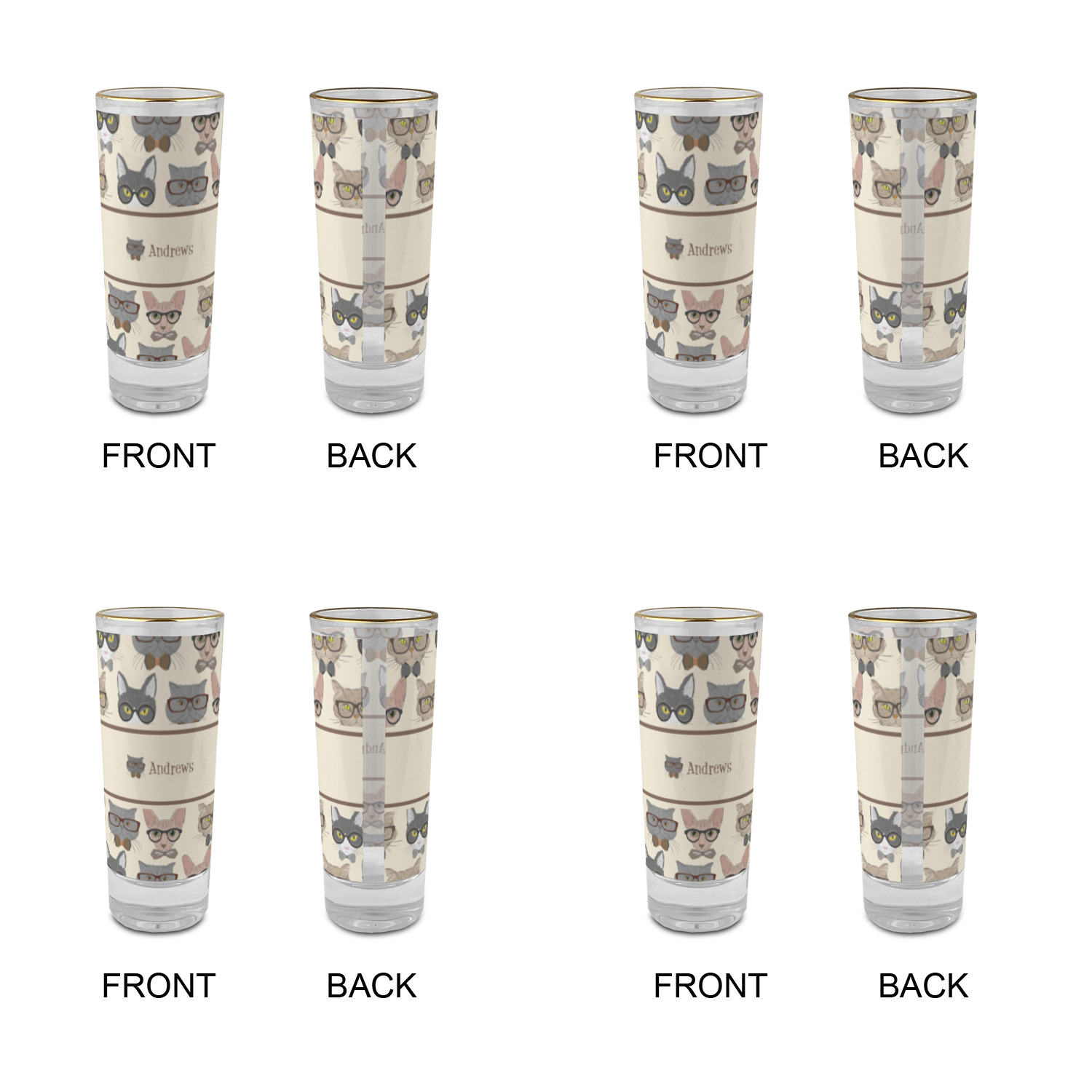 These glass shooter glasses are printed in full color with the design of your choice. These are a tall shooter 2 oz size and stand 4" tall. The print is a full wrap design to boldly display your personalization.