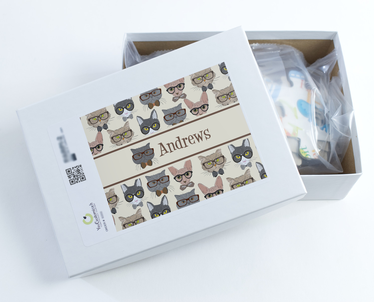 We chose a classic ribbon in vintage brown along with an image of one of the cats (all 4 cats are available) and name for personalizations.