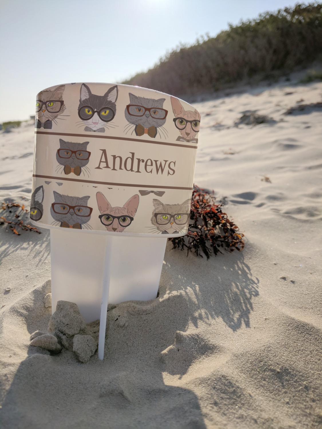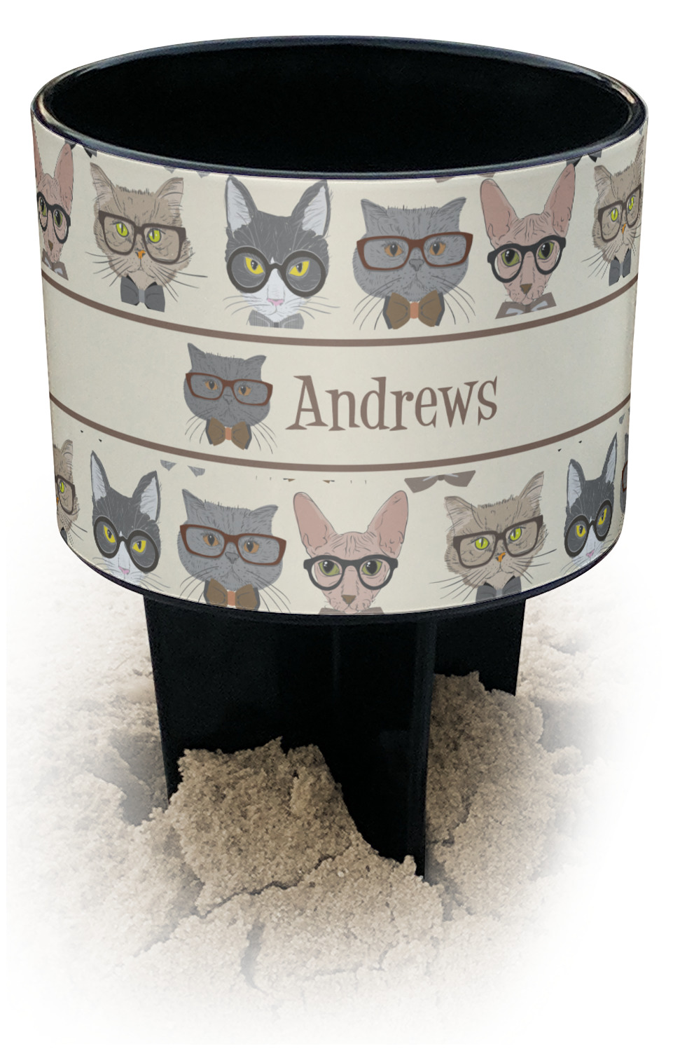 This cup holder has a large stake at its bottom that anchors it to the sand or ground below, while the cup holder rests above the stake. The entire drink holder is made of durable plastic and displays your customization around the cup holder portion. We sell these personalized beach spikers in two different colors: black and white.