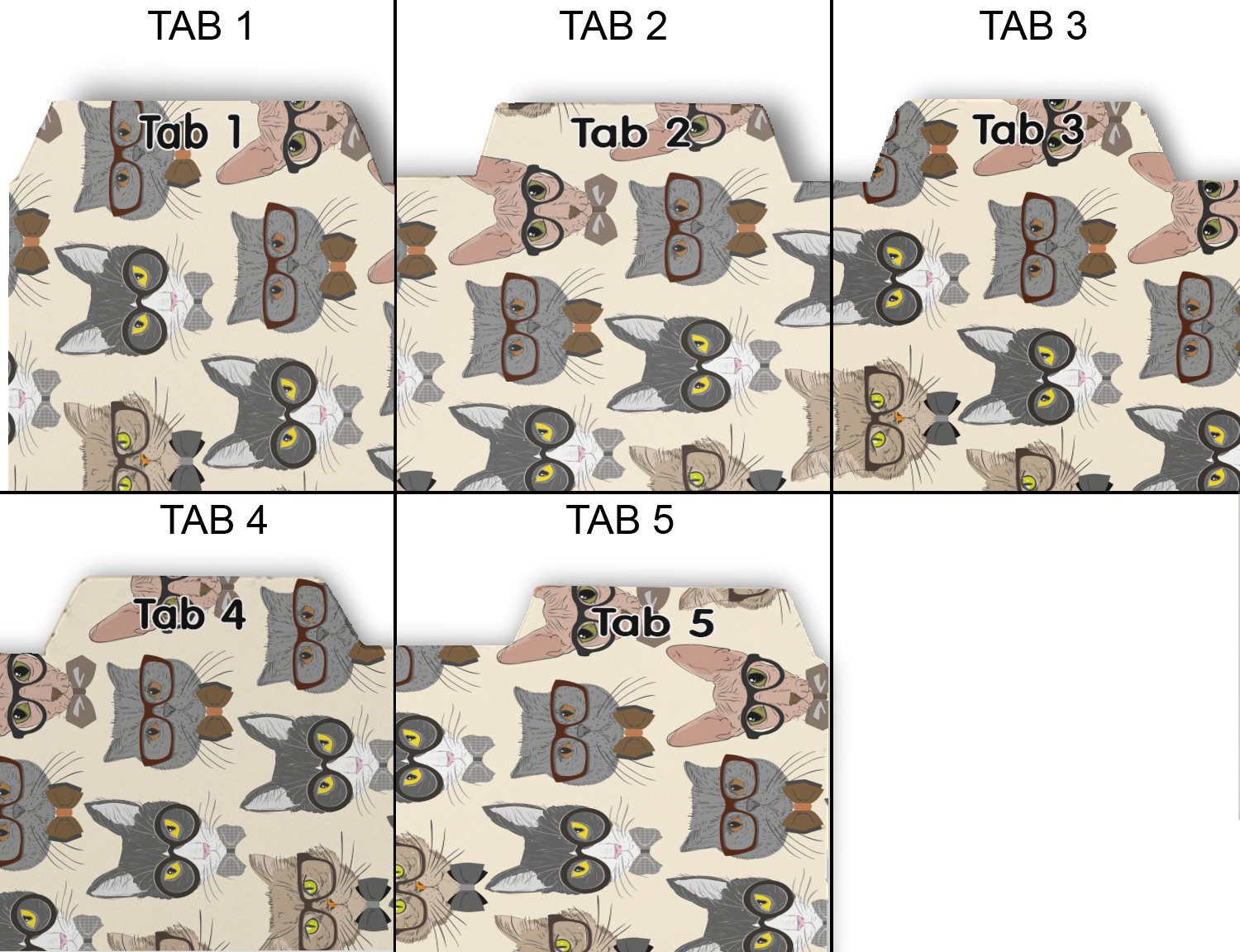 Whether you use binders at school or at work, we have designs to suit all of them. Available in 5 or 6 tab sets, you are sure to find a set to suit your needs. The back of each one is white and can be used to take notes, write vital information on, etc.