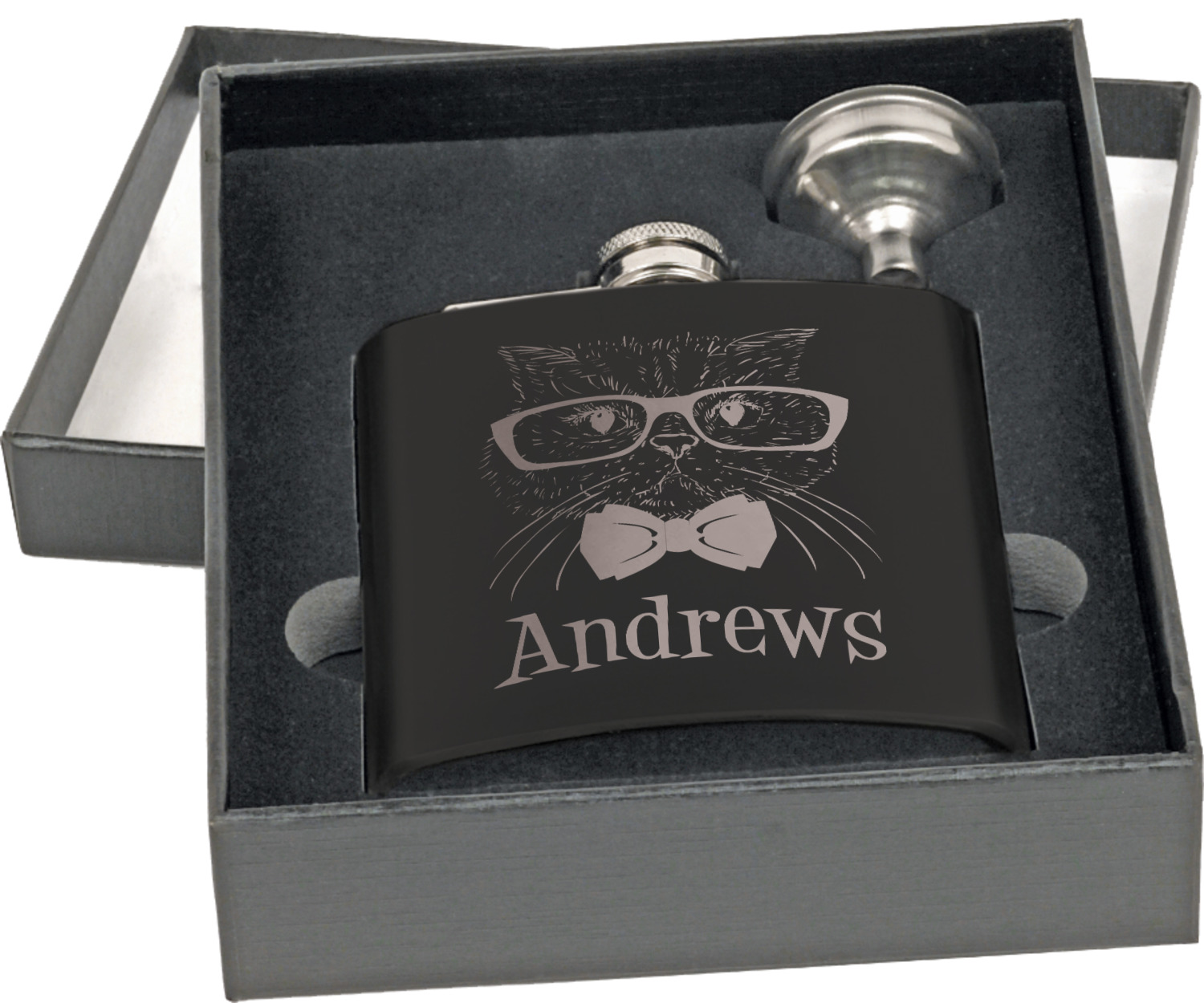 Built from a stainless steel and then covered with a black coating, this hip flask, has a very classy appearance. Similar to the standard flask, this stainless steel flask has the traditional curved shape for a snug fit in your palm. This flask set also includes a traditional screw and flip lid and liquid funnel in a gift box. At 4 by 4.5 inches, this flask can hold up to 6 ounces. Your personalized design is laser-engraved across the front of this flask.