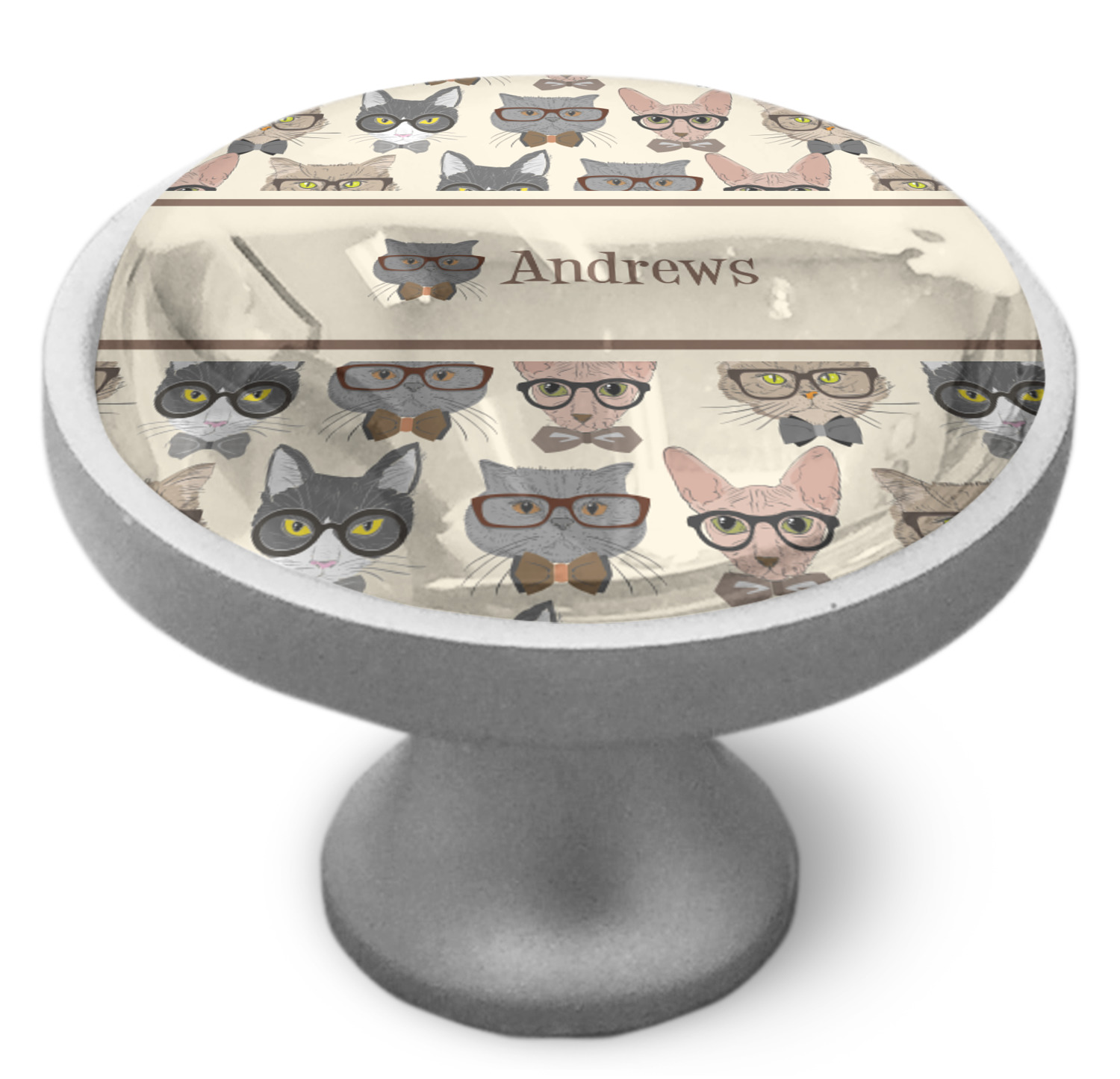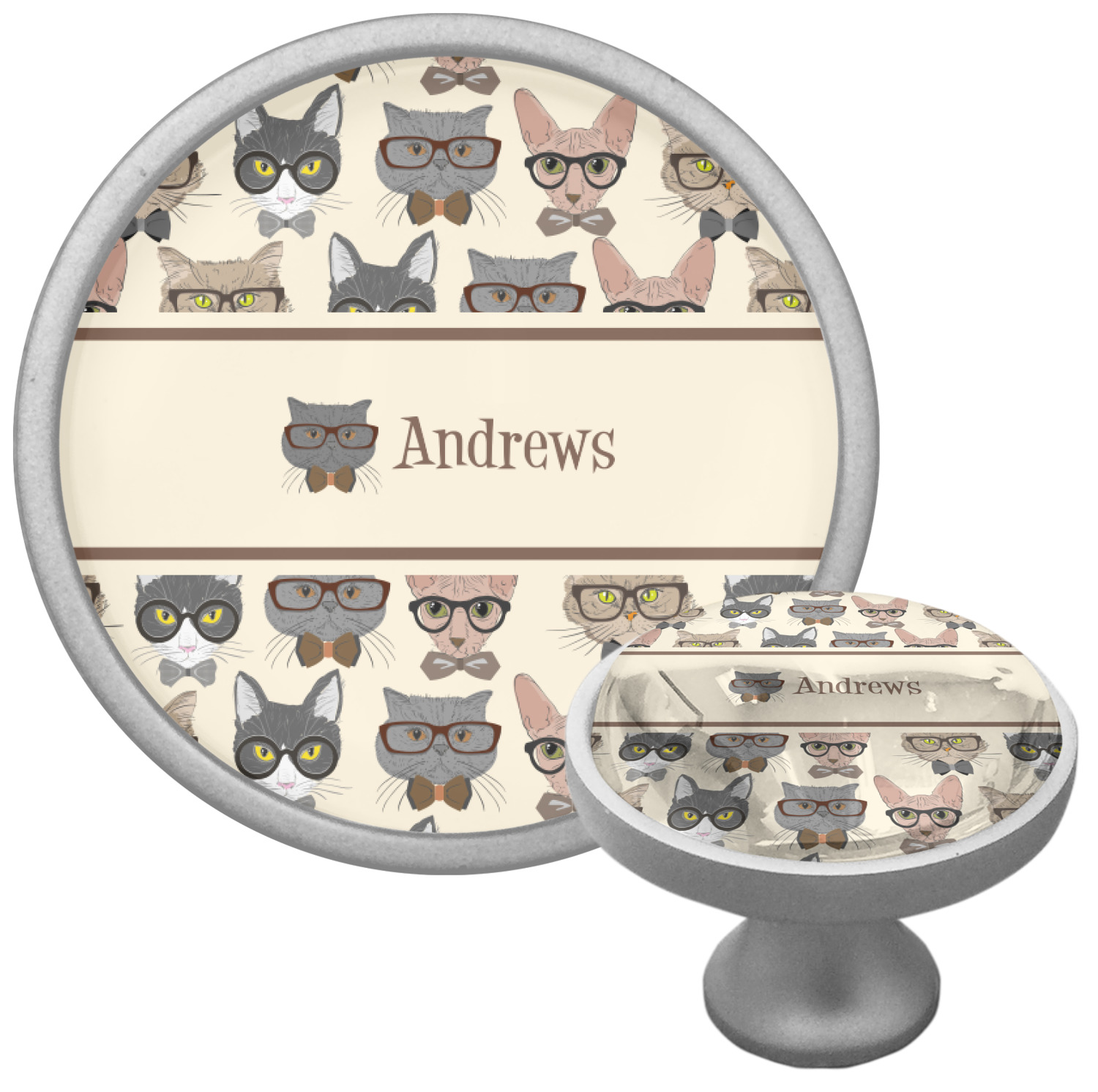 We sell these cabinet pulls in two different colors to better match your room's color scheme. We offer an oil-rubbed bronze base that is black in color, and a satin nickel option, which has a silver color. Your design is displayed across a high gloss vinyl insert that is placed on top of these cabinet handles. We then place a 1 inch thick glass cabochon atop the design, which seals the cabinet knob and makes the colors of your customization stand out. These custom cabinet knobs are approximately 1.3 inches in diameter. Your purchase includes a 1 inch screw that can be used to mount the knob to any cabinet in your home.