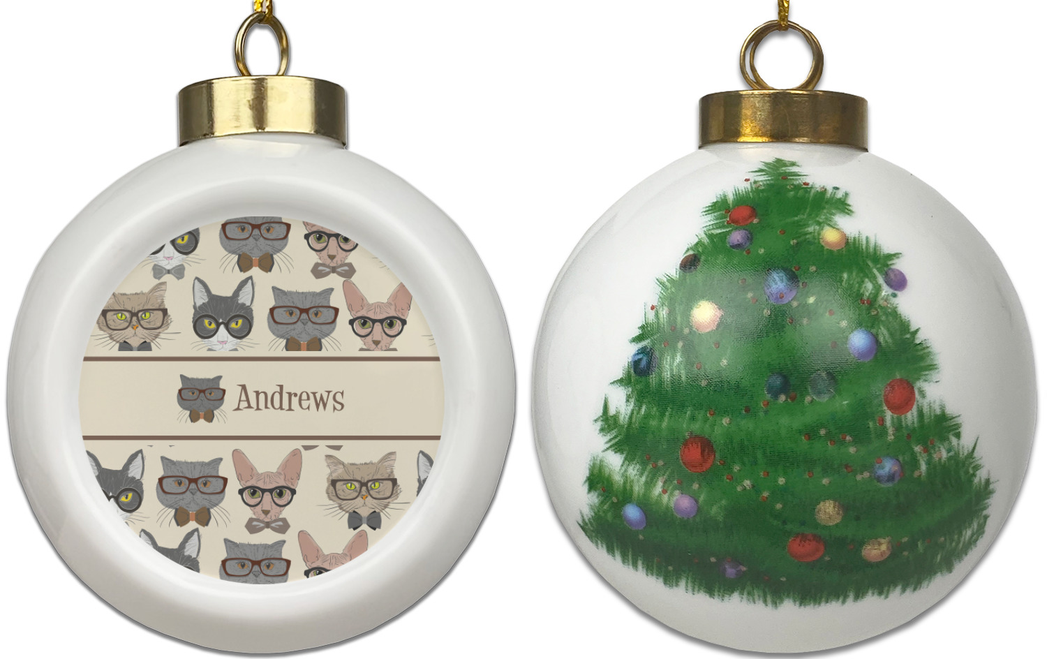 Our Christmas ornaments are a unique ceramic ball shape with a twist as it has a flat face to display your custom design! Select from one of our two design types - Christmas Tree or Poinsettia Garland - to adorn the curved back of your personal design. Each ornament measures 3H x 2.5W x 2D accompanied with a gold string accent for finishing touches to hang on your beautiful Christmas tree!