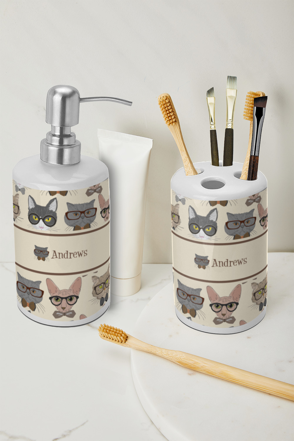 Both pieces of the set are made of white ceramic with a glossy finish. The dispenser has a brushed stainless nozzle and plastic pumping mechanism. The top easily screws off and on to refill. The toothbrush holder is one solid piece with four holes on top and one hole on the base. The top four holes measure 3/4 inch in diameter, and the hole at the base is 1 inch in diameter. The design does NOT wrap all the way around. There is about a one inch white stripe on the back of both items.