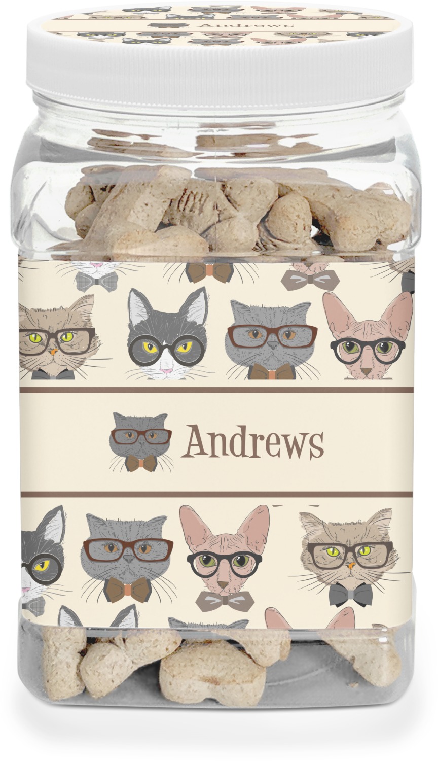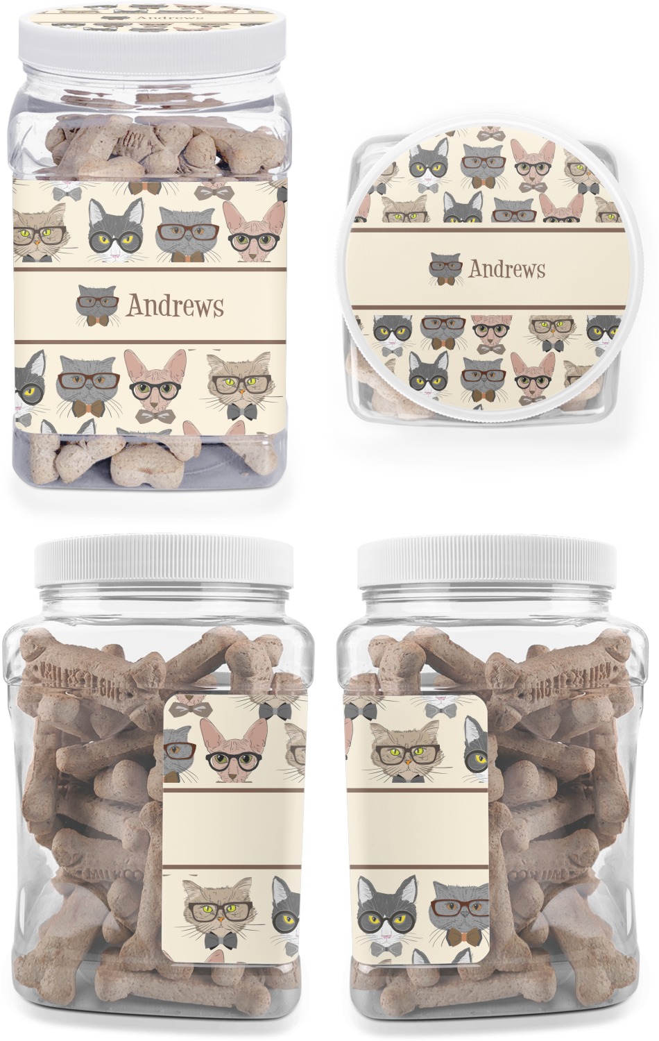 This half gallon jar, made from a sturdy plastic, is the perfect way to keep treats from any naughty pet paws, while still keeping them ready on hand for when your pup performs an impressive trick. This dog cookie jar features a screw-on, white lid that displays your personalized design on a vinyl sticker. We apply another customized sticker that wraps around the front and sides of the jar. Our dog treat jar also has indentations on the rear ends of the sides, which allows for convenient handling, and its square frame allows for easy storage.