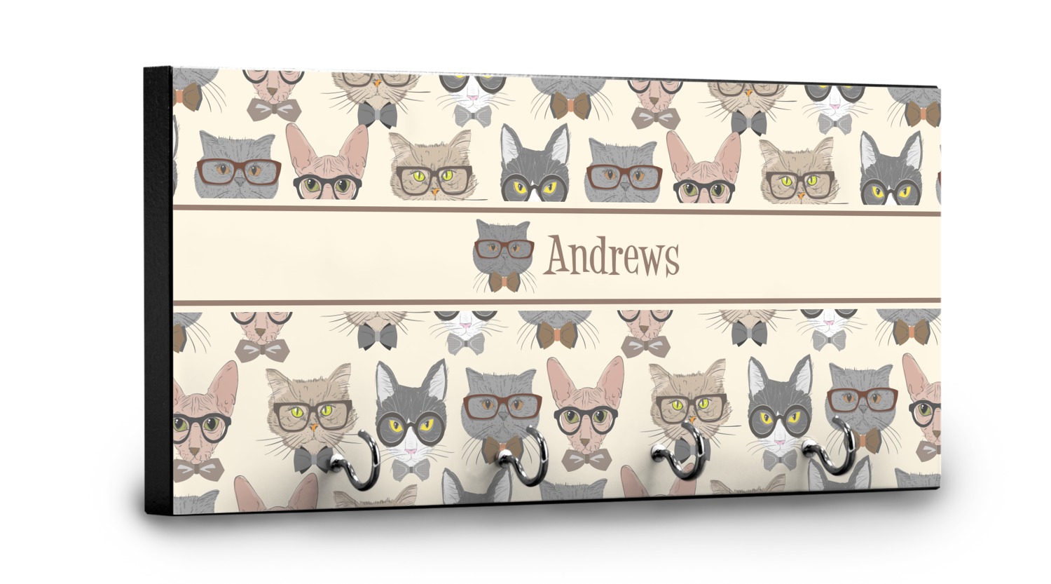 This 11" x 5" key hanger is made of sturdy wood and has four metal hooks lining the bottom. This is the perfect size for a family with several drivers. Not only can you hang keys on it though, but pet leashes and other small items. The board is black on the sides and back and is printed with the design of your choice on the front.