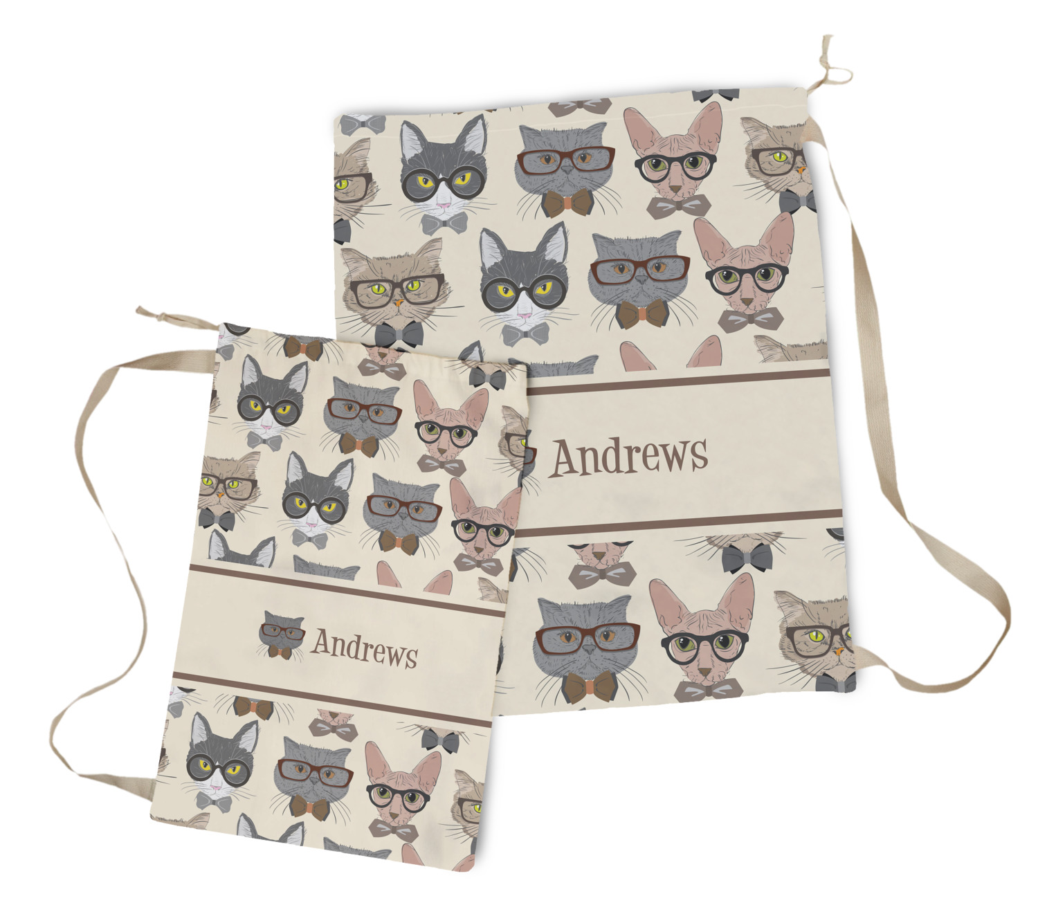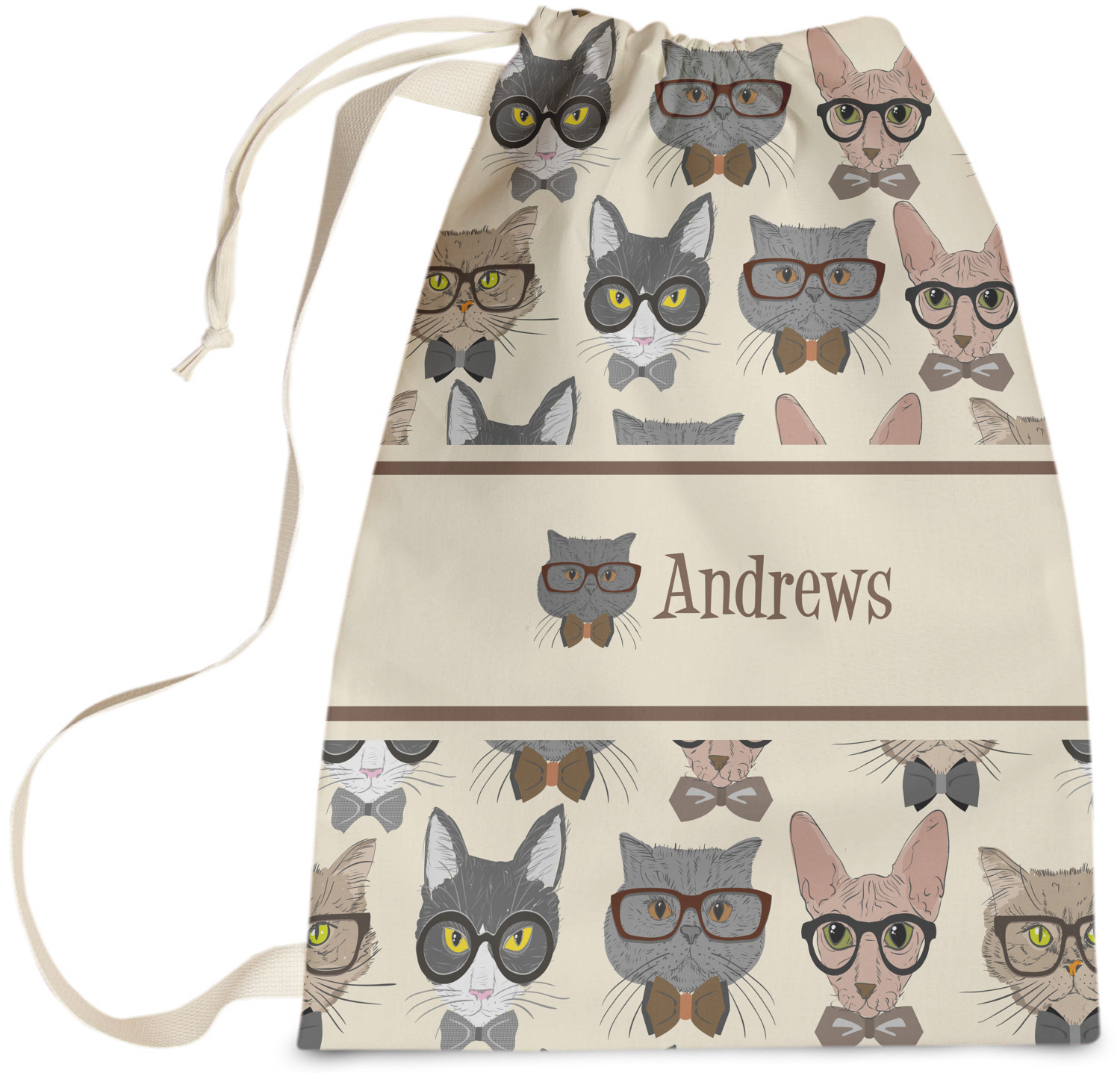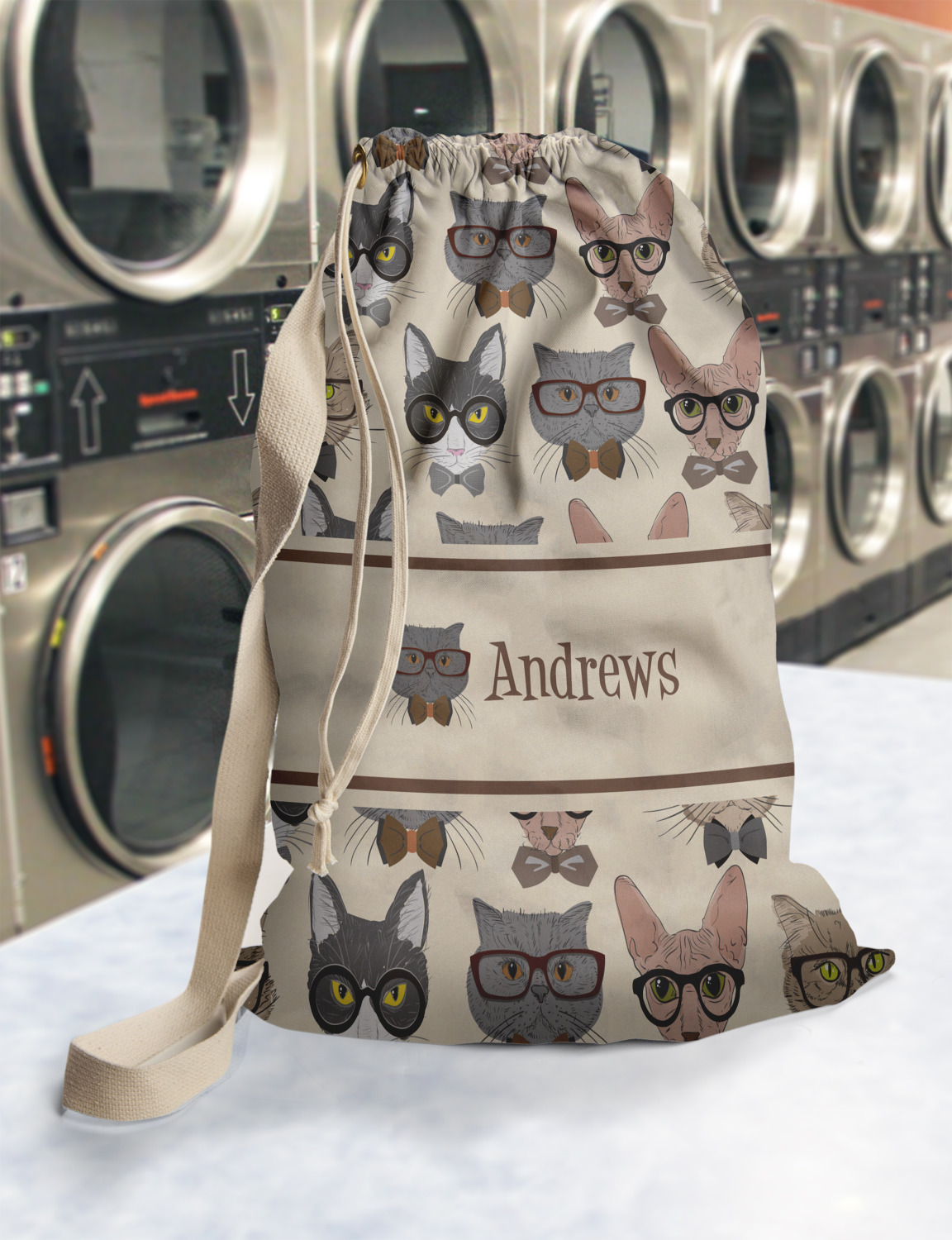 Carry your laundry in style with these customized laundry bags. Available in two sizes, featuring a natural colored woven strap and a cinch cord, these bags hold a lot of clothes or anything else you want to fit in them.