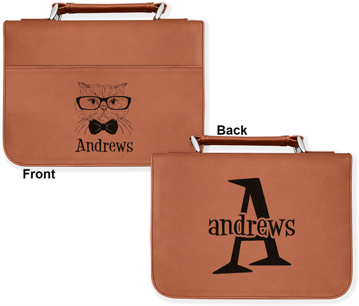 These book covers are fabricated from a fine leatherette in a warm, cognac shade of brown. A wide pocket spans across the front of the book jacket [2,400] and can store any loose papers or notes that you wish to keep. The interior of this personalized Bible cover includes slots on both sides to house the covers of your Bible, and keep it in place. The inside of the spine has a small elastic band to secure a pen. A zipper lines three sides of the cover, while the fourth side features a reinforced handle that allows for easy transport of your enclosed book.