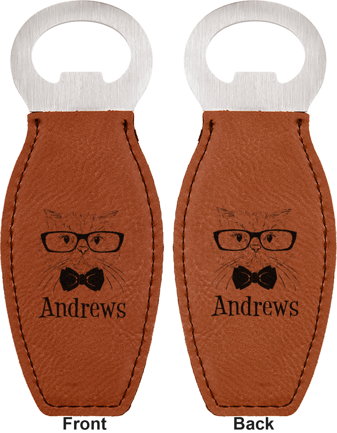 Built from stainless steel, these custom bottle openers are wrapped in a cognac-colored leatherette. Sharp, black stitching lines the edges for extra durability and a finished touch. Your personalization is laser-engraved onto the surface of this leatherette, leaving behind a crisp, black coloration. At 4.6 by 1.8 inches, this beer bottle opener gives you much of leverage when trying to open a stubborn bottle. On the opposite end of the opener, you'll find a magnet that you can use to display your new, unique bottle opener!