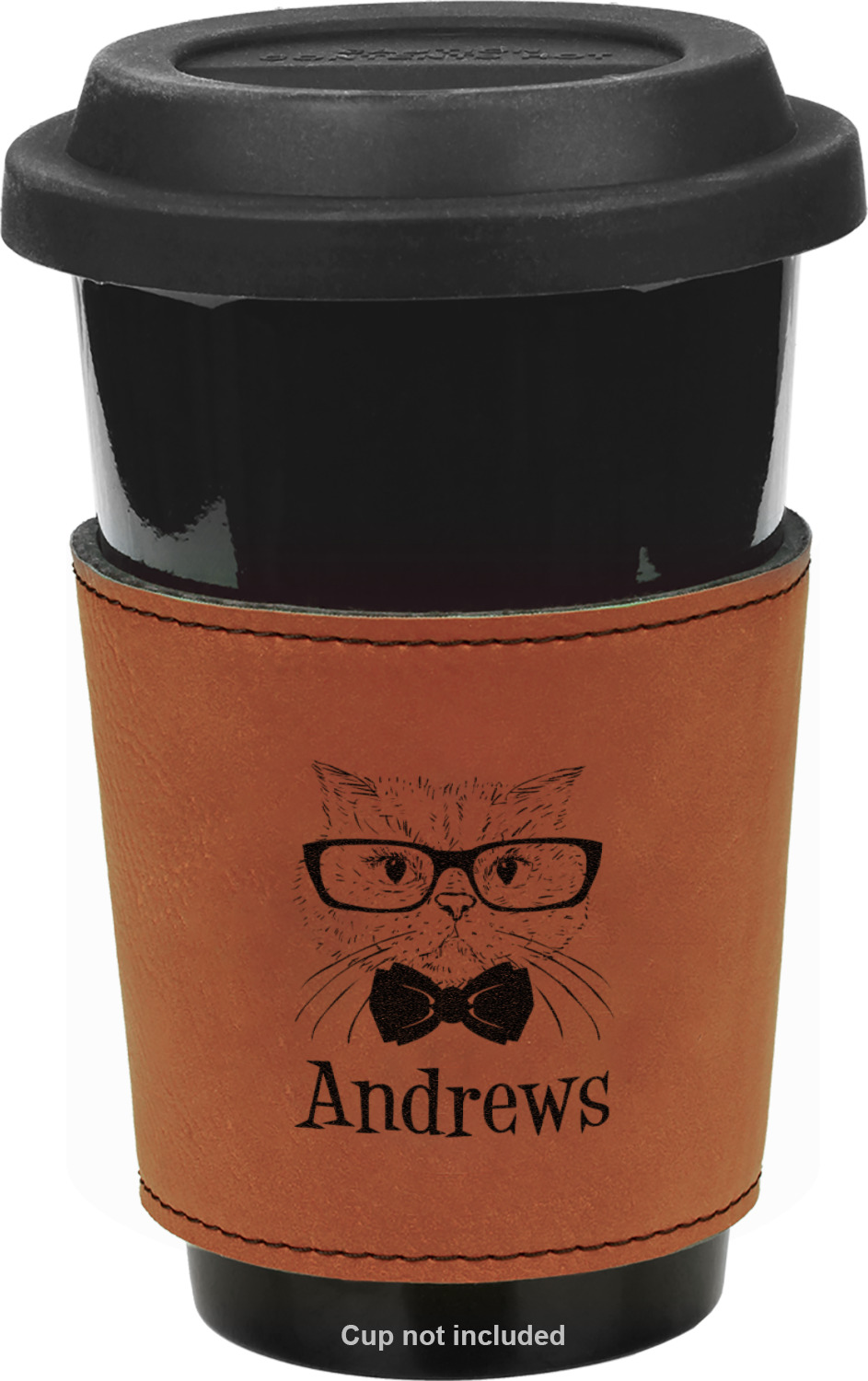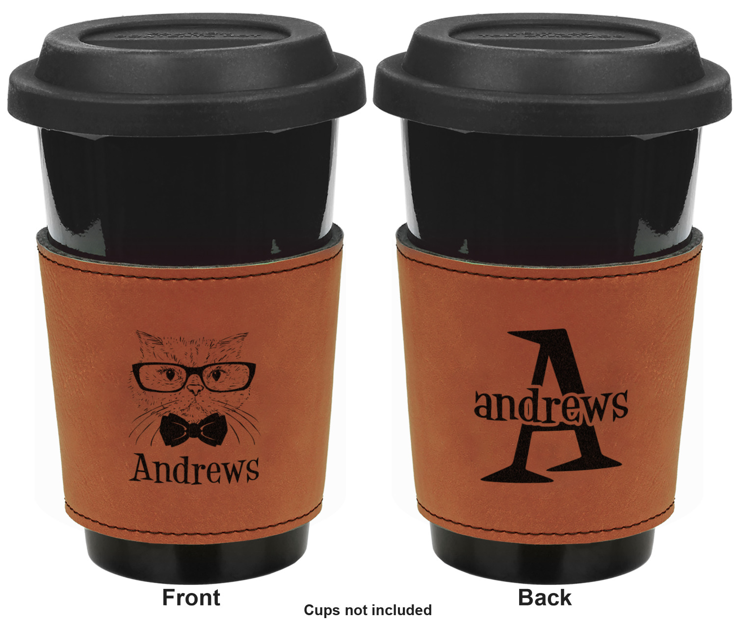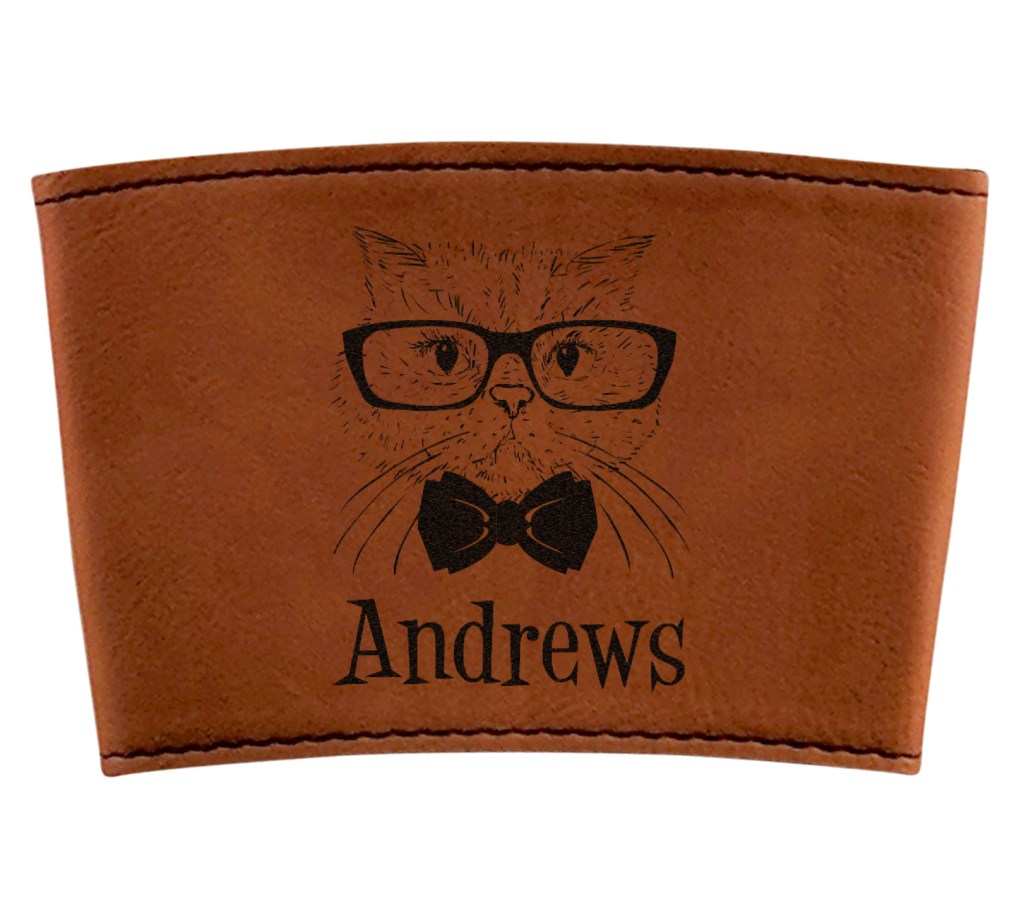 This cup sleeve is made from a suave, cognac-brown leatherette and finished with an intricate, black stitch. The interior of this can sleeve is fabricated from a thin foam material to help insulate your mug's contents. The sleeve is specifically made to suit tapered glasses or mugs, so the top's diameter is 3.5 inches, while the bottom's diameter is 2.75 inches. Your customized design will be laser engraved into the leatherette, leaving behind crisp, black imprint. With these products, we provide you with the option of engraving the front and back, or the front only.