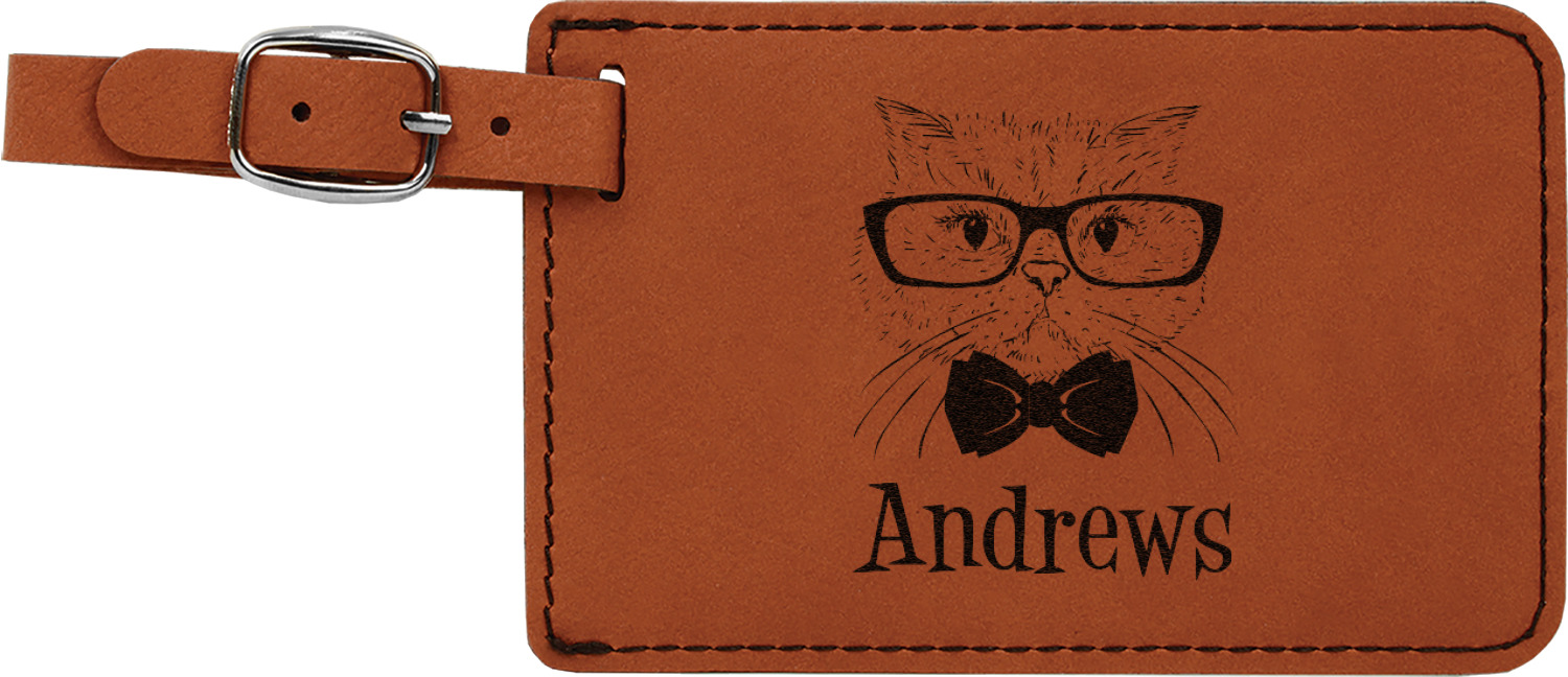 This luggage tag will surely be able to get you started in having all the right tools for traveling. It is made of a beautiful leatherette material that is a nice shade of cognac brown. The front of the tag is where your design goes. The sturdy black stitching gives your design an extra pop and gives the tag extra durability. The back of the tag has a clear vinyl window where you can slip in your address card. The tag comes with a great little buckle strap that you can easily use to clip to your suitcase. The tag itself measures at approximately 5.5"W x 4.25"H.