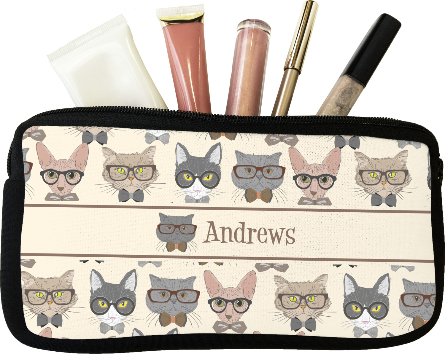 Our personalized makeup bags are available in many different designs, patterns and colors - so you are sure to find one that will love. They are made of neoprene (same material as wet-suits) and thus are water resistant, so spillages in your makeup bag will not end up all over you purse. They are customized on one side and are black on the other side and the zipper is black as well.