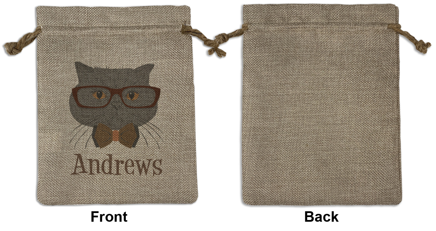 We sell our Burlap Gift Bags in 3 variant sized bags. Made with burlap polyester, each personalized bag can be secured with a twine drawstring pull. Your custom design is available to print on one side or both sides - completely up to you! The sizes of the bags measure approximately 4.5" x 6.5" for the smallest size, 6.5" x 8.0" for the medium size, and 6.5" x 13.5" for the large-sized bag.