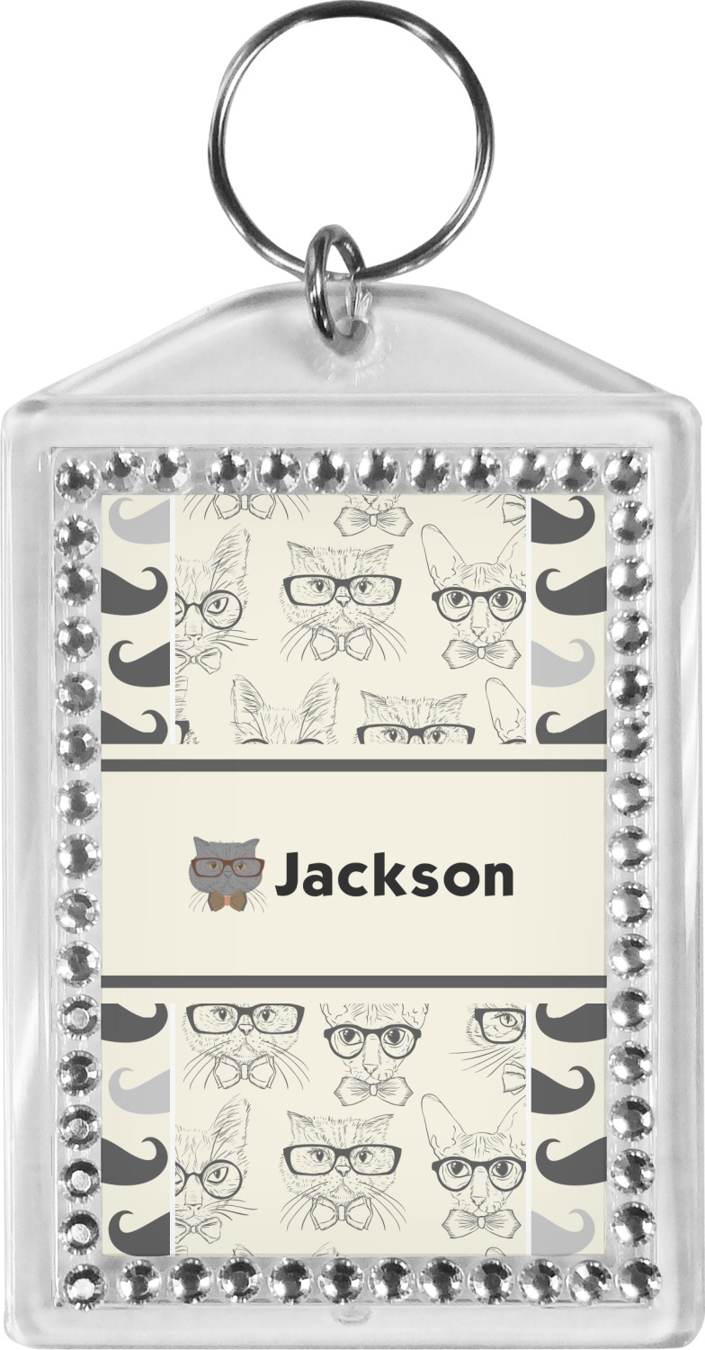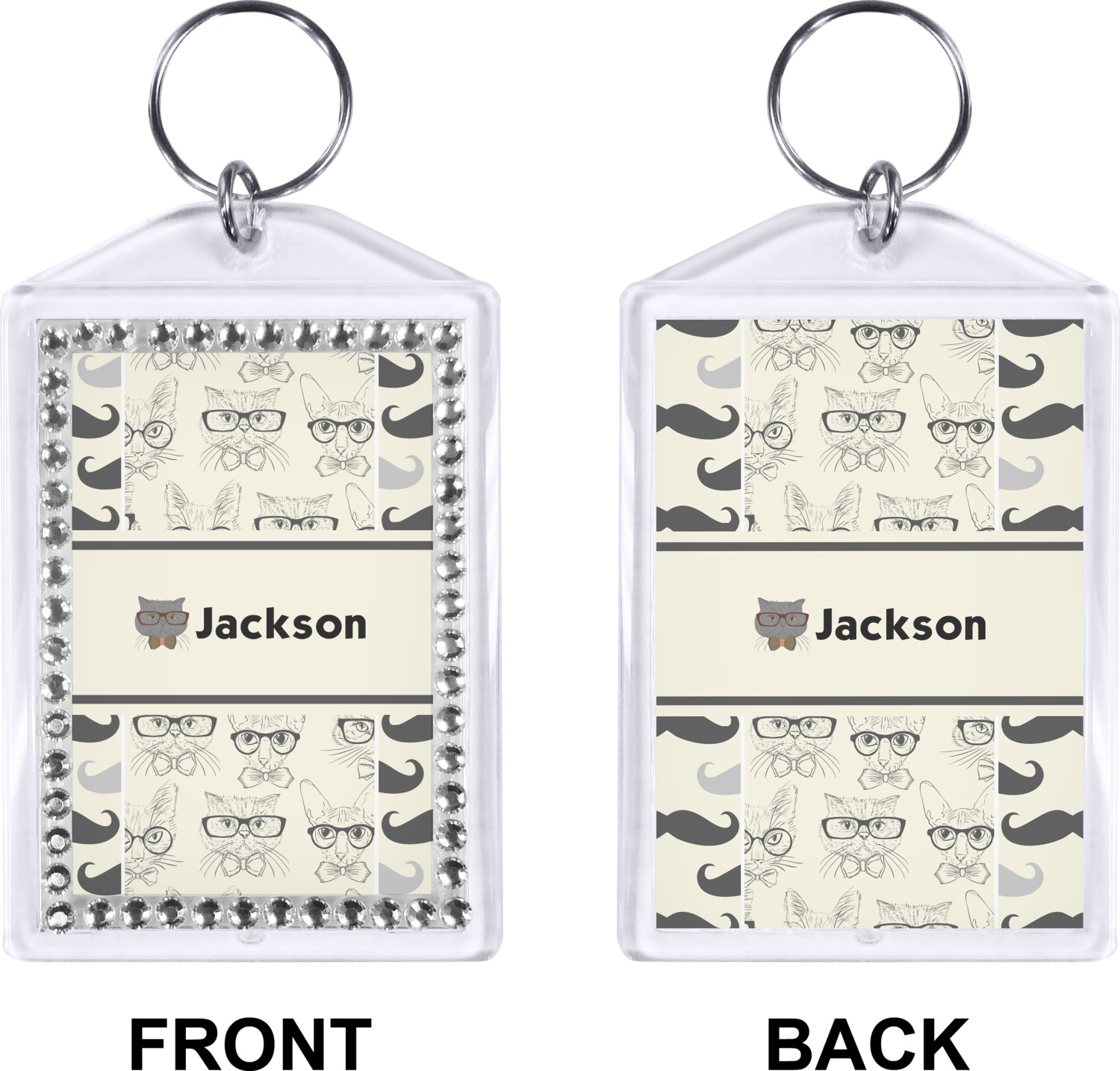 Our personalized keychains have a bold, rectangular shape, outlined by a series of shimmering rhinestones. A metal, split keyring is included with your purchase, and an additional metal hoop allows for attachment of the keychain to the split ring. This unique keychain measures at about 3.75 by 2.5 inches. We print your customized design(s) across both the back and front of this keychain.