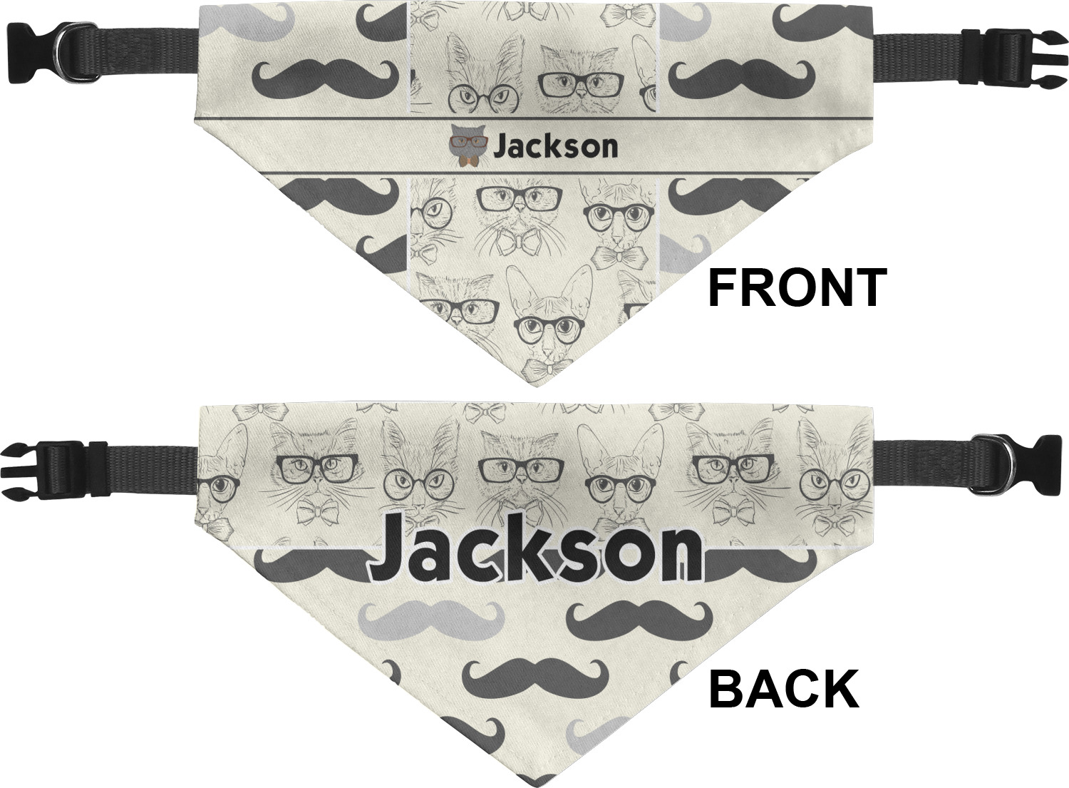 We print the front and back of these dog bandanas with your customized design. The bandana itself is made from a durable polyester, sewn together with a gap large enough to accommodate any collar. Regardless, the bandana includes a plain black, canvas collar with plastic snaps, that can easily be removed if desired. These dog bandana collars are available in four sizes: small, medium, large, and extra large. Please see our sizing chart for more information regarding the dimensions of each size.