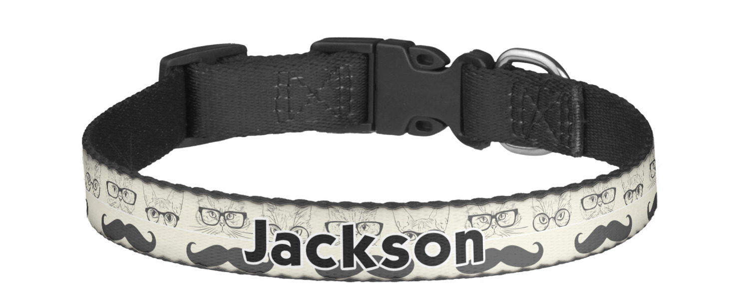 This sturdy collar, made from a durable nylon weave, will outlive your dog's episodes of excited tugging and pulling. Courtesy of its thick plastic buckle and adjuster, this collar is adjustable and accommodating of any dog. Structurally, the collar is a single piece of nylon weave that is sewn together, and features a solid metal loop where you can attach a leash or dog tag. We print and display your dog's name and pattern across the middle of the personalized dog collar.